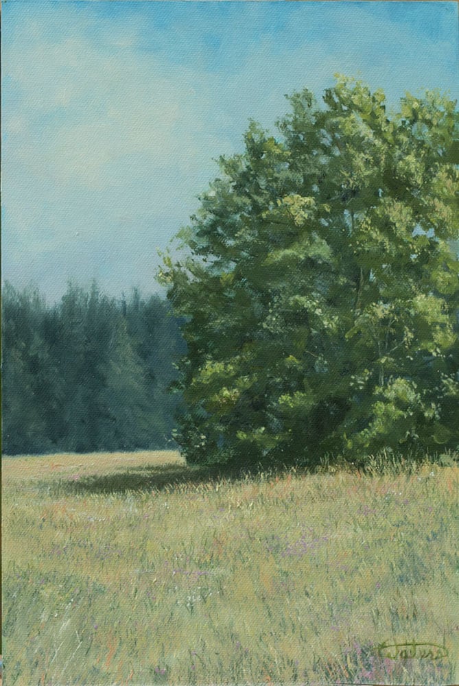 Painting of the Barber Farm Fields in Jericho Vermont, one of my favorite summer painting spots. The fields turn a beautiful mix of yellows, tans, greens and purple with wildflowers and weeds lending color. Islands of trees dot the fields providing long views and nice mid-ground to break up the fields.