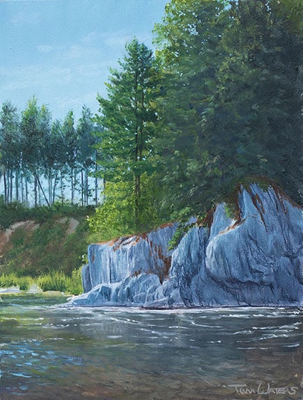 Dog's Head Falls along the Lamoille River in Johnson Vermont is a popular spot in the summer. The falls themselves are attractive and the water below the falls suitable for a cooling dip. This little painting is just below the base of the falls as the water runs out along the cliffs on the far bank. There is nothing special about this particular view, but the light was right and the moving water juxtaposed against the hard rock I found attractive. This is one of those small paintings that have a bigger presence than their actual size would suggest.