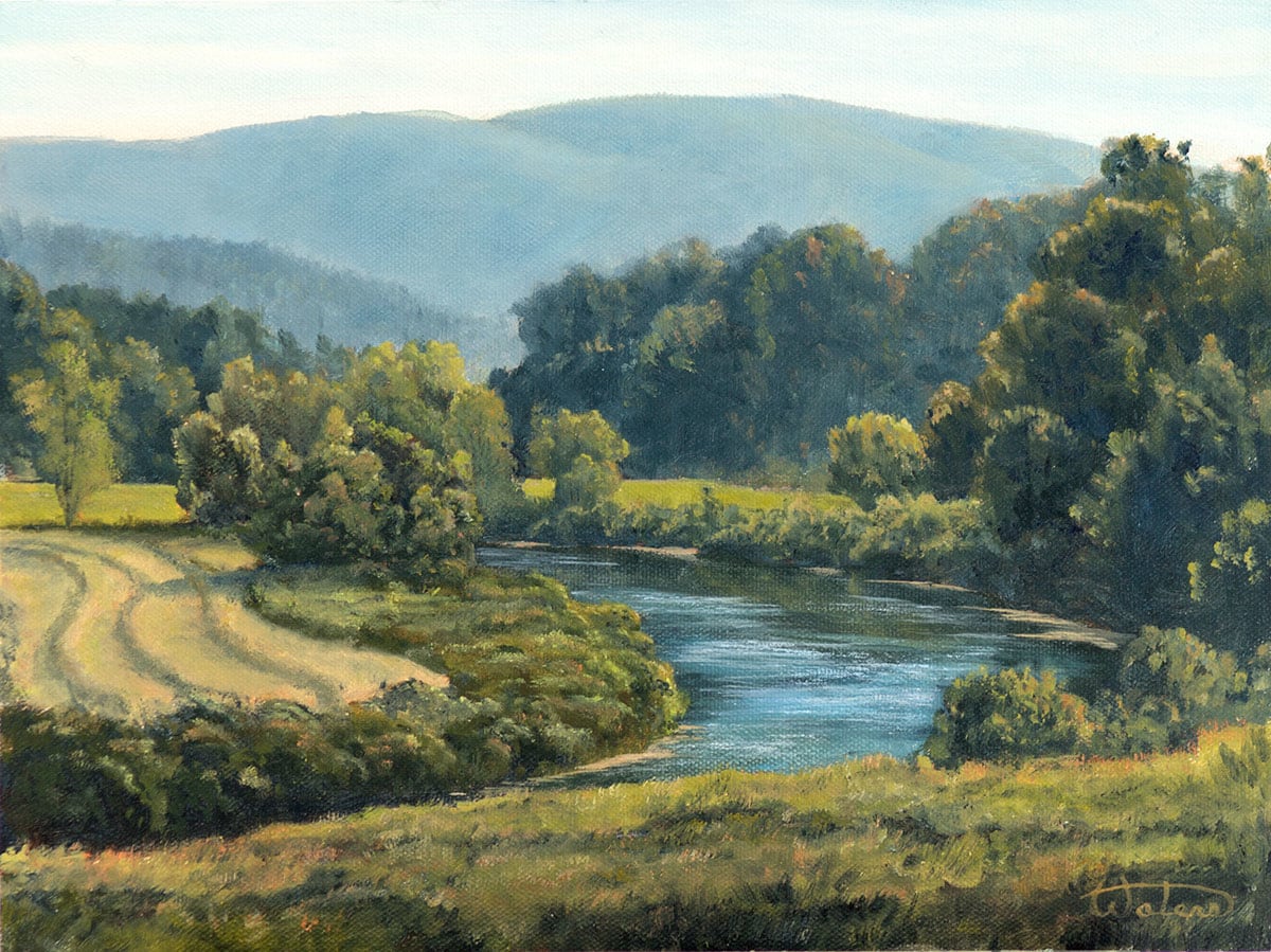 The Lamoille River offers all kinds of painting possibilities. Many of them in view right from the road. This particular view is right off Pumpkin Harbor Road in Cambridge, less than a mile from town. I've passed it many times, but on this particular day the light was late in the summer sky and the field on the town side of the river had been cut and rolled to dry. I like the lines created by this drying hay, mimicing the bend in the river. I was attracted to the multiple textures from sky and water to fields and trees this painting presented. Often summer scenes have too much green to make a good painting, but the reflected sky, drying hay, and deep shadows created a fuller palette of colors to paint. My summer palette typically has Cadmium Yellow, Yellow Ochre, Ultramarine Blue, Cerulean Blue, Paynes Grey and a red. In this case Terra Rosa. I mix my greens with the blues, and yellows. Sometimes adding a lighter yellow to the palette for this purpose. Overall I really like both this scenes and this painting. I may have to revisit it this winter in deep snow.