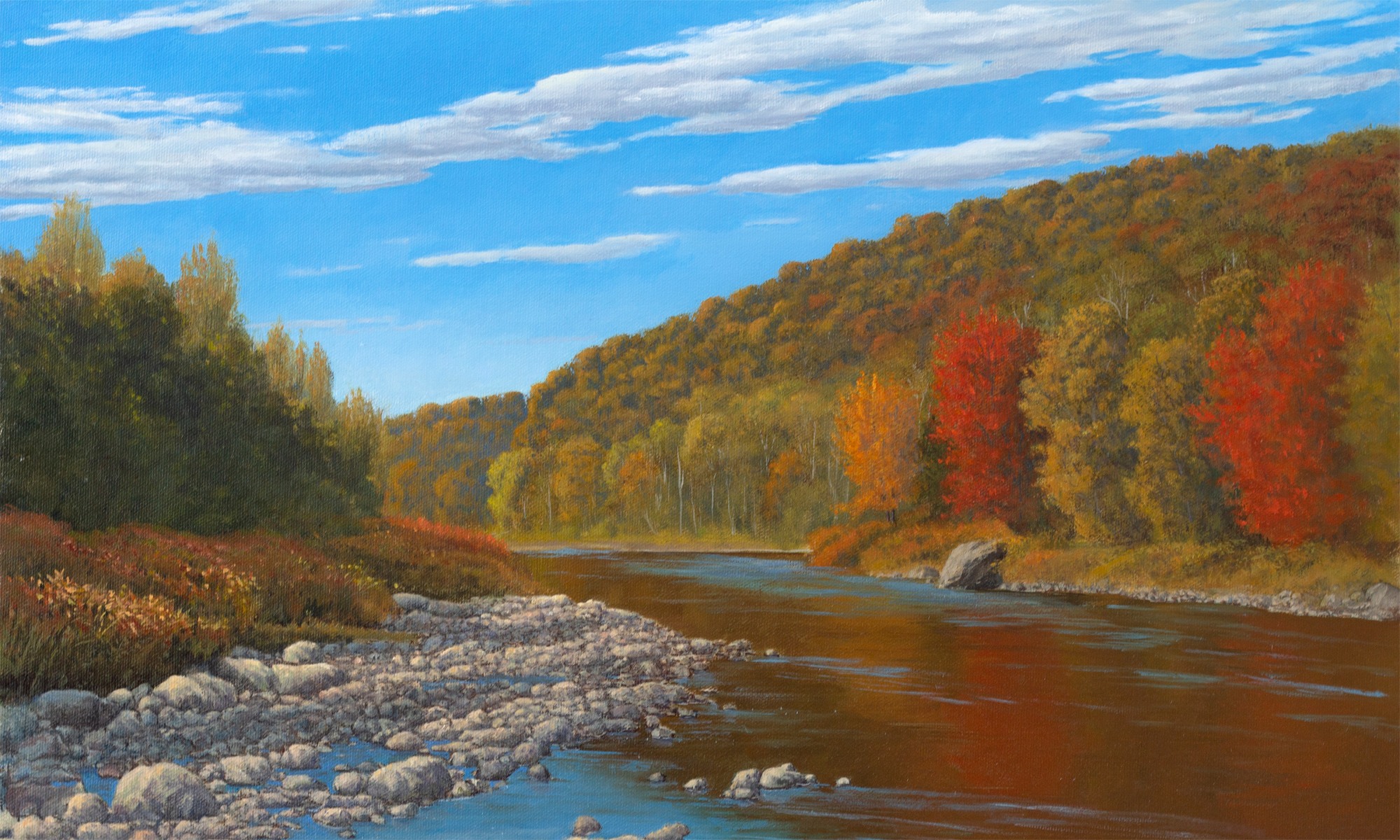 Due to an overnight rainstorm, there were areas where I had to introduce or exaggerate the color where the wind had blown off many of the leaves. The title is the result of the feeling I had that I would love to paddle along the river and take in every turn and corner. Bring me a paddle and a canoe, give me my camera, and I could be supplied with material for a long time to come!