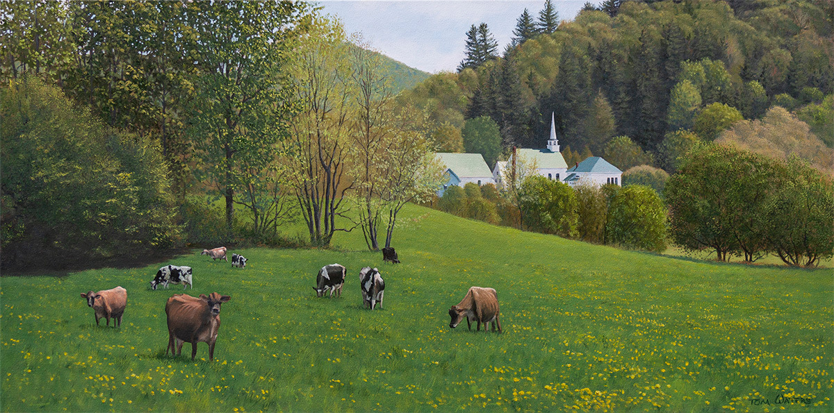 To me this painting captures quintessential Vermont, with its hilly terrain, open fields, cows and a perfect little church steeple in the distance.