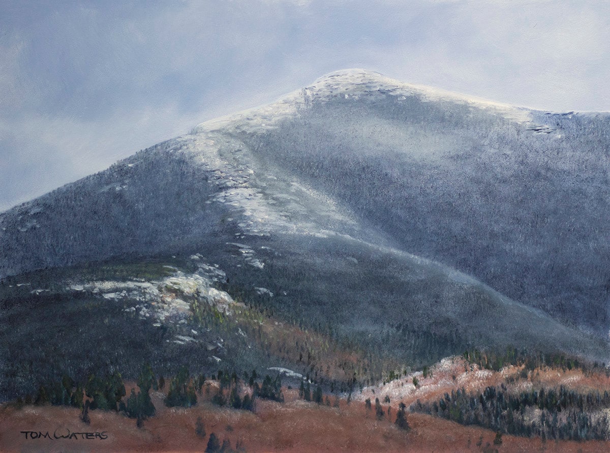 Mount Mansfield is painted often, usually from the Cambridge side and usually encompassing the entire mountain and foreground. It offers many views and opportunities to paint it from many angles. For this piece I was struck one day while driving through Underhill by just the ridgeline running up Sunset Ridge with a light coating of snow. The mood it edited was subdued but still showed the power of the mountain. I chose to leave only enough of the mountain to define it for those who are familiar with it, leaving to the imagination of those unfamiliar where this might be. It's the light and the sense of ascent up the ridge that captures my interest as I hope it captures yours.