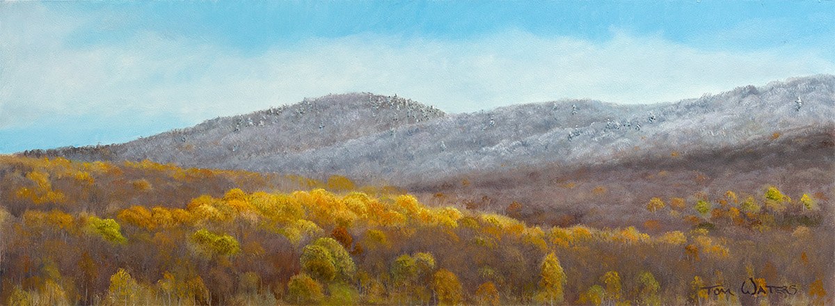I just love that first dusting of snow we get in the fall, while autumn colors still grace the hills. This was one of those days last year, along Route 15 opposite the old Clarkâs Truck Stop. The format of this painting allowed for the cropping out of the house just below this view.