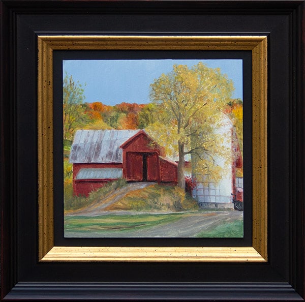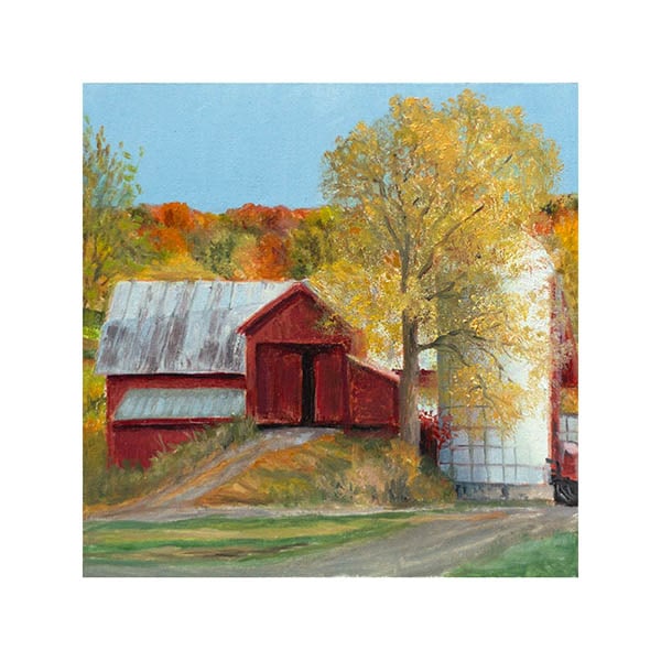 The barn pictured here is in Sheldon Vermont and is first viewed as you round a corner. It seems to be almost huddled against itself, a defense against long Vermont winters. In the early autumn light though it jumps out with its bright color and proud silo. Painting this small has rewarding challenges and works best with views that have strong focal points.