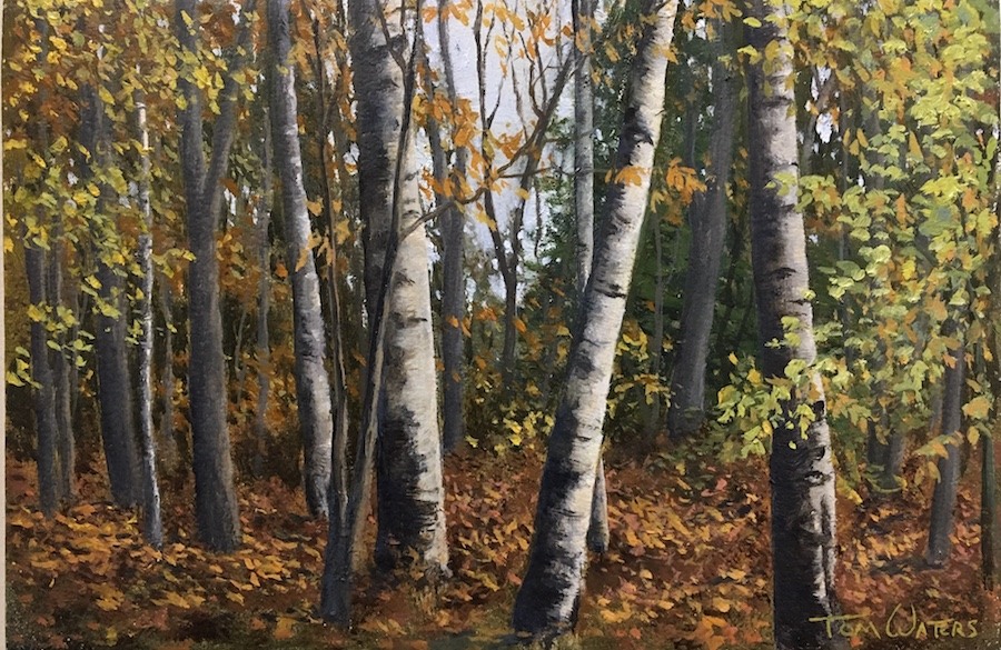 I've been spending time painting more trees in different settings. This happens to be from a photo taken out my window as I was driving down the hillside at the Southern Vermont Arts Center. At first I thought it might just be a simple exercise or study in painting woods without a strong focal point. However it turned out better than expected so I decided to keep it around. Birch trees are a favorite subject for me, and these are a bit more raw and realistic than the more photographic white birch with their pristine trunks. Painting dense woods with depth is a challenge and this is a nice stepping stone to more complex works.