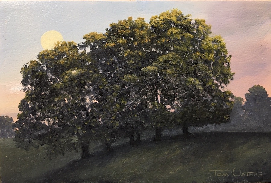 I have always admired tonal works by other artists and wanted to try something a little more tonal myself. So this is my first attempt as a "tonal" painting, if it qualifies. The simplicity of a group of trees in the evening light with the full moon rising behind them is a common subject for many artists. Something about that full, or almost full, rising moon as the evening light colors the sky makes for a compelling subject. Adding just a hint of that last bit of sun hitting the tops of the trees adds a nice bit of warmth.