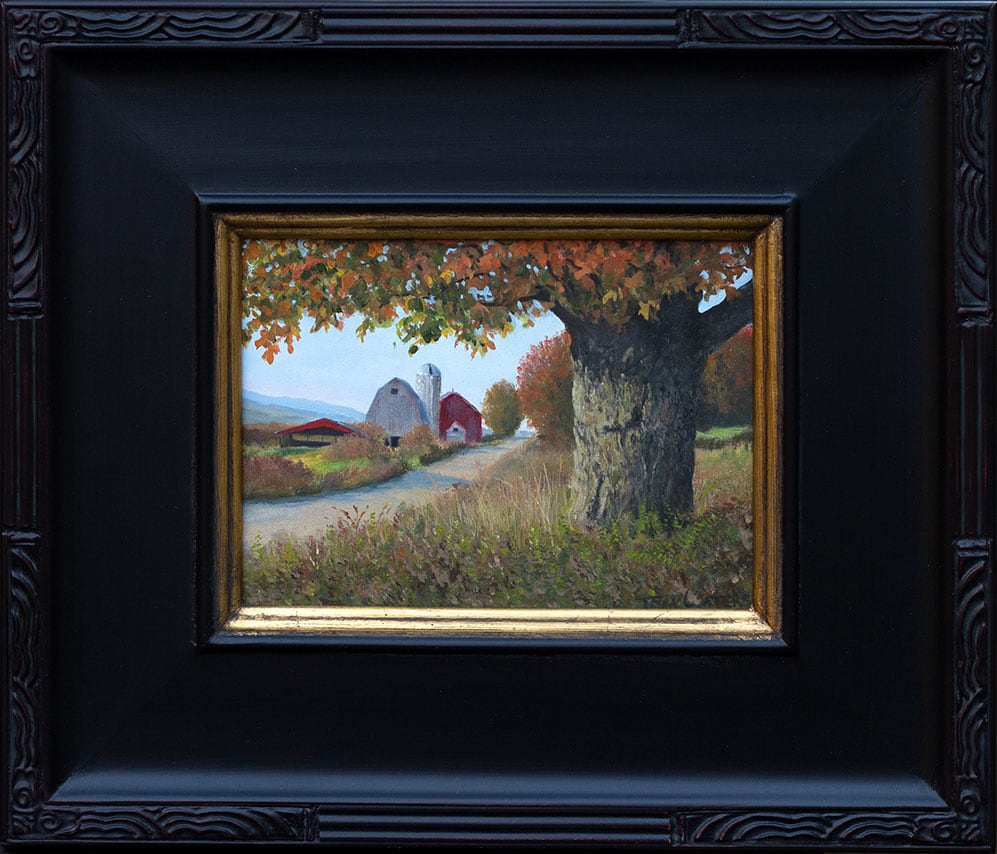 This is my second painting of this wonderfully scenic farm in the northern most regions of Berkshire Vermont. The first, "Maple Hill Farm" takes a longer view from up the road, while this one frames the farm nicely from under a well-aged maple tree. A fitting location to capture the essence of the Maple Hill Farm. The farm barn itself has a unique upright form I haven't seen much of elsewhere. A little digging into the history of it might be my next endeavor while I wait for a deep snowfall to see how winter settles over this farm.