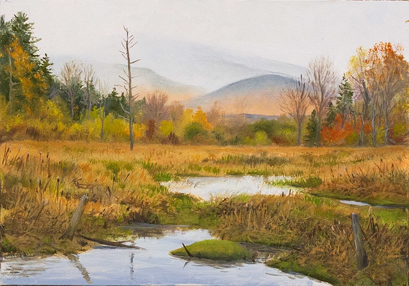 The view itself is along a new section of the rail trail in Jeffersonville Vermont with great views of Mount Mansfield. On this particular day the mountain was obscured by clouds, all morning, but the hide and seek gave the view a little mystery and brought the eye down to the waning color in the lower hills and fields.