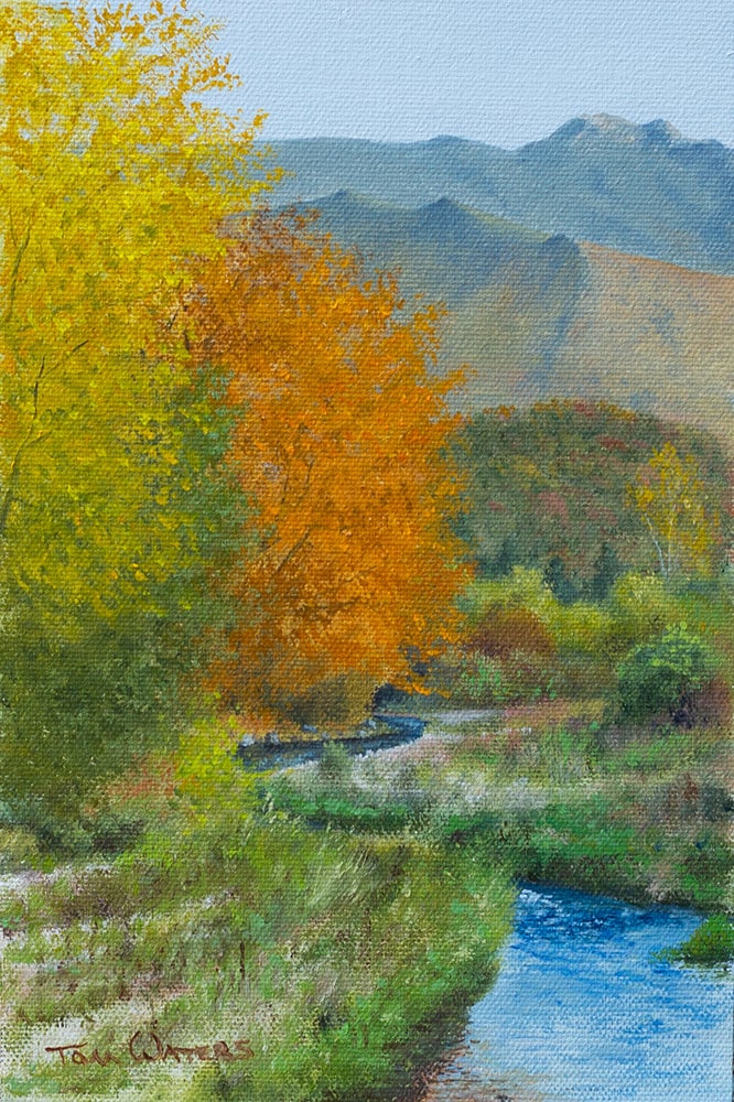 But every artist offers a different take. In this painting the mountain is less the center of attention but just playing peekaboo around the bend in the stream. Its a little bit different than the usual composition for this location. This small piece is also on a canvas panel instead of my usual smooth panel, so the overall paint application is a little less detailed.