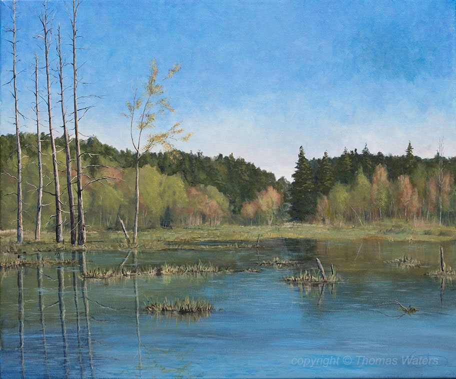 Painted from photos taken along route 15 in Underhill Vermont. Several photos were used from throughout late winter and early spring. Beaver ponds along route 15 called Underhill Flats. The tall dead trees stand like sentinels overseeing the beaver ponds, hence the title "Old Guard".