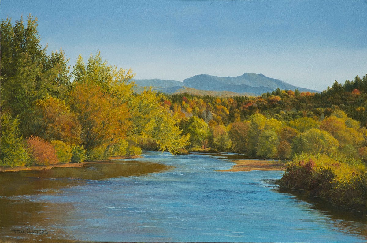 This view of Mount Mansfield overlooking the Lamoille River is just as you enter Jeffersonville Vermont on route 15. This particular day, with the late afternoon sun catching the trees along the river, the autumn color made a nice contrast to the blue of the mountain, sky and water. The river sometimes gets very low or muddy after a rain, but was running clear. I pass this spot every time I go to work and it's amazing how different it looks almost every day. This day was perfect.