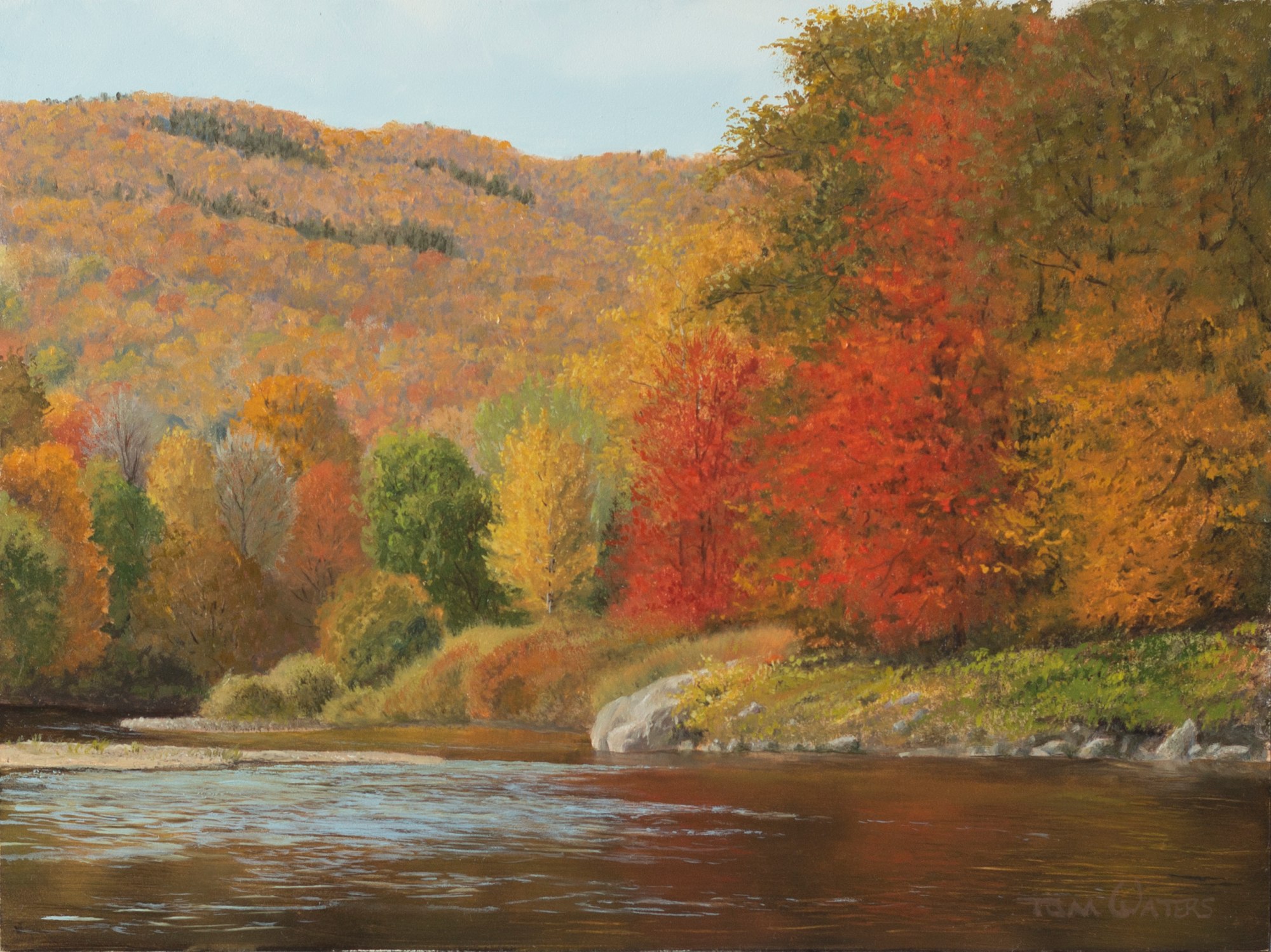 The challenge with autumn in Vermont is the overwhelm of color. It makes for great viewing but not always great painting since so much is going on to compete for attention. The river adds a nice settled element that keeps the overall painting from being overwhelmed by all the color. It is just great fun to paint.