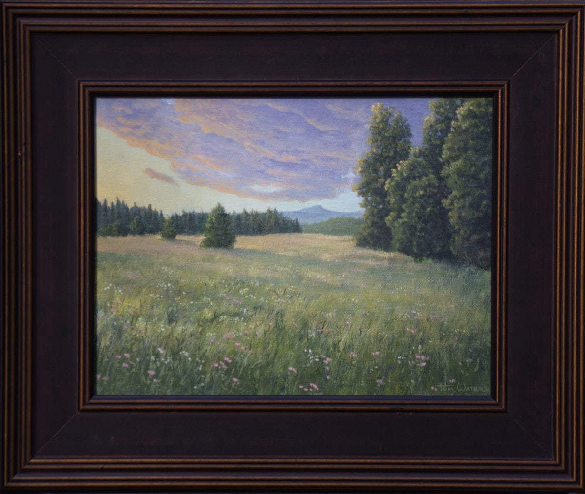 I have painted various views of the fields at Barber Farm in Jericho Vermont numerous times. For this painting the initial attraction to painting it was the colorful field flowers and long view, but with a clearing storm and low sun the sky adds a bit of drama. It would be a more serene painting without the clouds, and that is a possibility too. However the darkened clouds picking up the purples of the flowers in the field presented a nice opportunity.