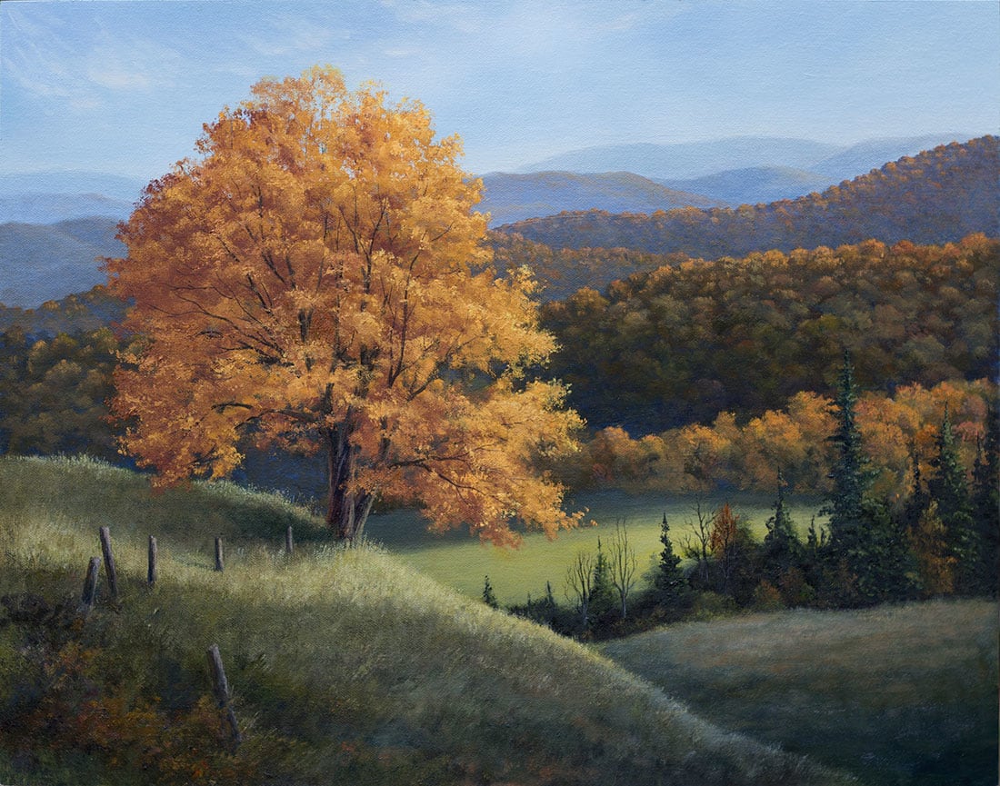 Bryce Hill in Cambridge Vermont has inspired more paintings than any place nearby, with the possible exception of Lower Pleasant Valley Road which sits just below Bryce Hill. After taking dozens of photos, in all seasons, and all conditions I finally settled on a late evening autumn photo as my main inspiration for this painting. Failing to find the perfect composition I combined a photo of the light hitting the hillsides, with one of a big maple tree along the road to arrive at this painting.