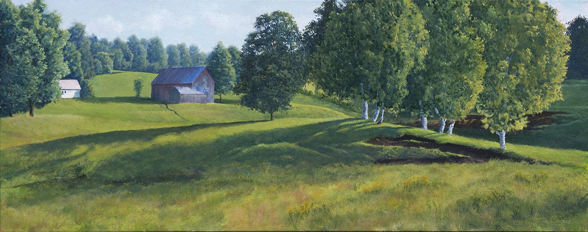 - Subject Matter: Landscape, Barns, Fields, Trees, Vermont, Summer, Birch Trees, Shadows