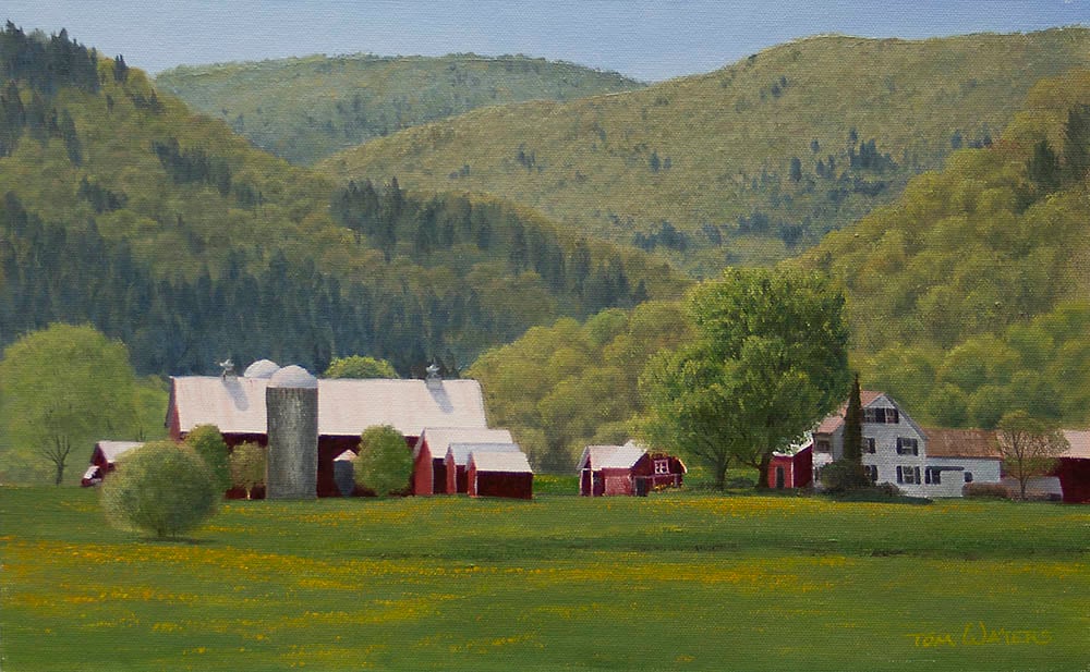 I visited in early summer when the trees were just finishing dressing up with leaves for the summer, and the dandelions were out. This farm, and view, is neighbors with the view that lead to an earlier painting (shown on this site) called Dairy and Dandelions. To get two nice paintings from the same basic location is an artists dream!