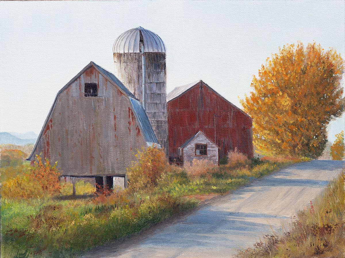 "Timeless Tranquility" is the third time for me painting this farm from different vantage points. For me, this painting captures the beauty and simplicity of rural life, with weathered barns and golden leaves painting a picture of peace and serenity. The warm light of early morning bathes the scene and I find myself just wanting to stand and take it all in. Sadly these farms are increasingly under stress and disappearing daily. Painting them lets me capture the moment and share how special our landscape is. The benefits of a place like this extend far beyond whatever products they produce. The speak to the impact nature has on our collective soul. .