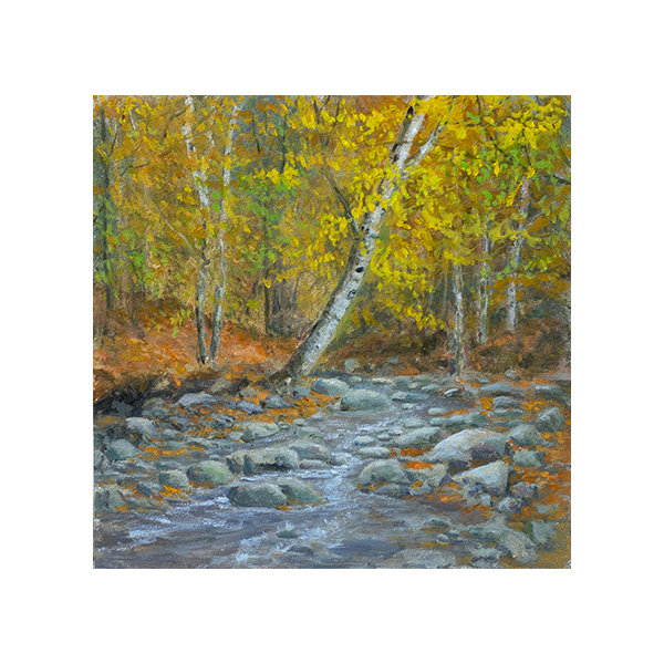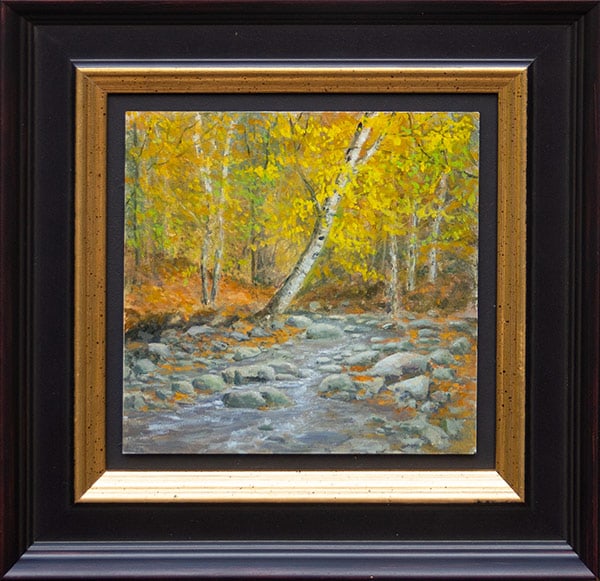 This was my first painting at this small size. For this first attempt at this size I wanted a scene with a good amount of detail. I was interested in the challenge of not only painting at this size, but of making a painting that really engaged the viewer up close. I chose this stream up in Hazen's Notch Vermont that I had considered painting as a large piece.