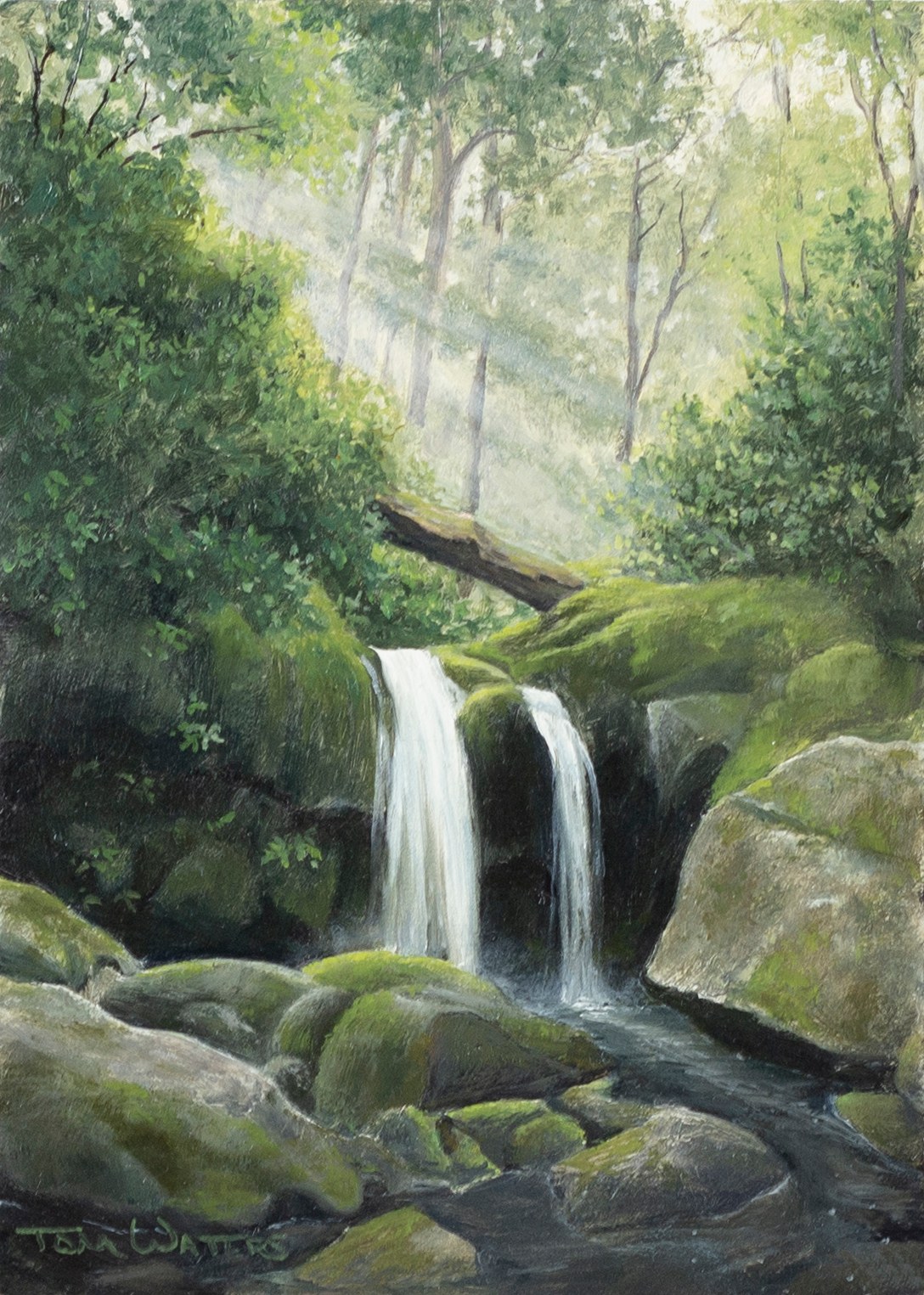 I've painted this location once before, in the piece titled "Woodland Waterfall" but I wanted another go at it that included more of the surrounding woods and area below the falls, and more of the sunlight that was streaming in through the trees.