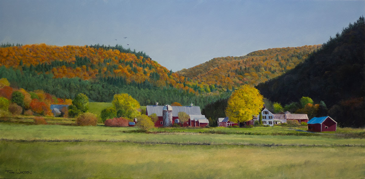 This Tunbridge Valley Farm resonates every time I visit. It sits so nicely in the valley framed by hills and mountains and the combination of barns, outbuildings, and homes with the natural elements provides great contrast, color, and visual interest. I found this piece challenging with all the architectural details but it was very rewarding to step back and see it all come together. When I first set out to paint this I found myself drawn to the main barn and so I actually painted a smaller painting/study of just barn first, which you can see below this piece .