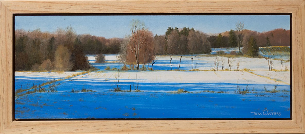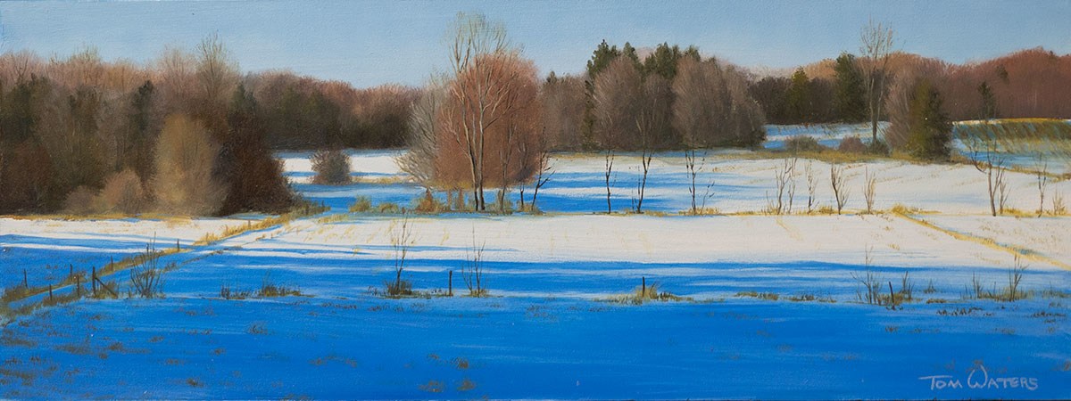 Winter can be long in Vermont. When the sun finally stays out into the evening, and the temperatures start to rise, the fields of Vermont start to show themselves again. Slowly. That transition is a really popular subject to paint. Instead of endless shades of snow the warm grasses expand the palette and ad bright warm tones to the cool winter shadows. Patterns under the snow on the fields get accentuated as they are partially reviewed.