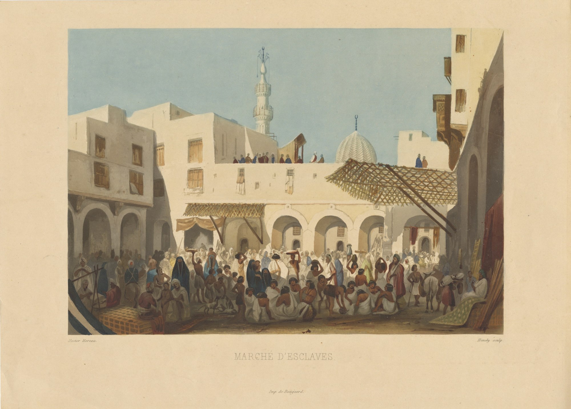 The slave market in Alexandria, engraving taken from Panorama d'Egypte et de Nubia (Egyptian and Nubian Panorama), Hector Horeau (1801-1872), Paris 1841.