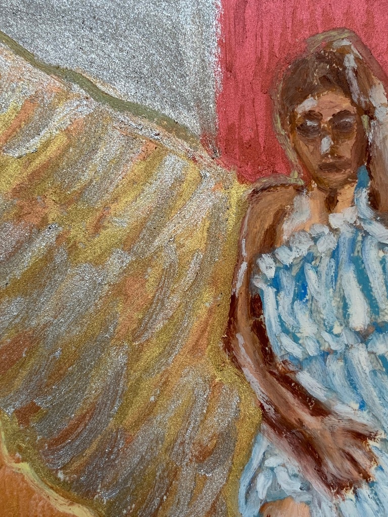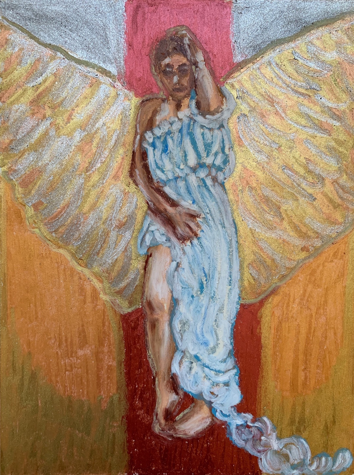 The Angel Healing, in oil pastel and metallic oil pastel, is resolute in her acts of service. She stands strong within the energy of Mother Earth as she connects to the Healing rays through her crown chakra.