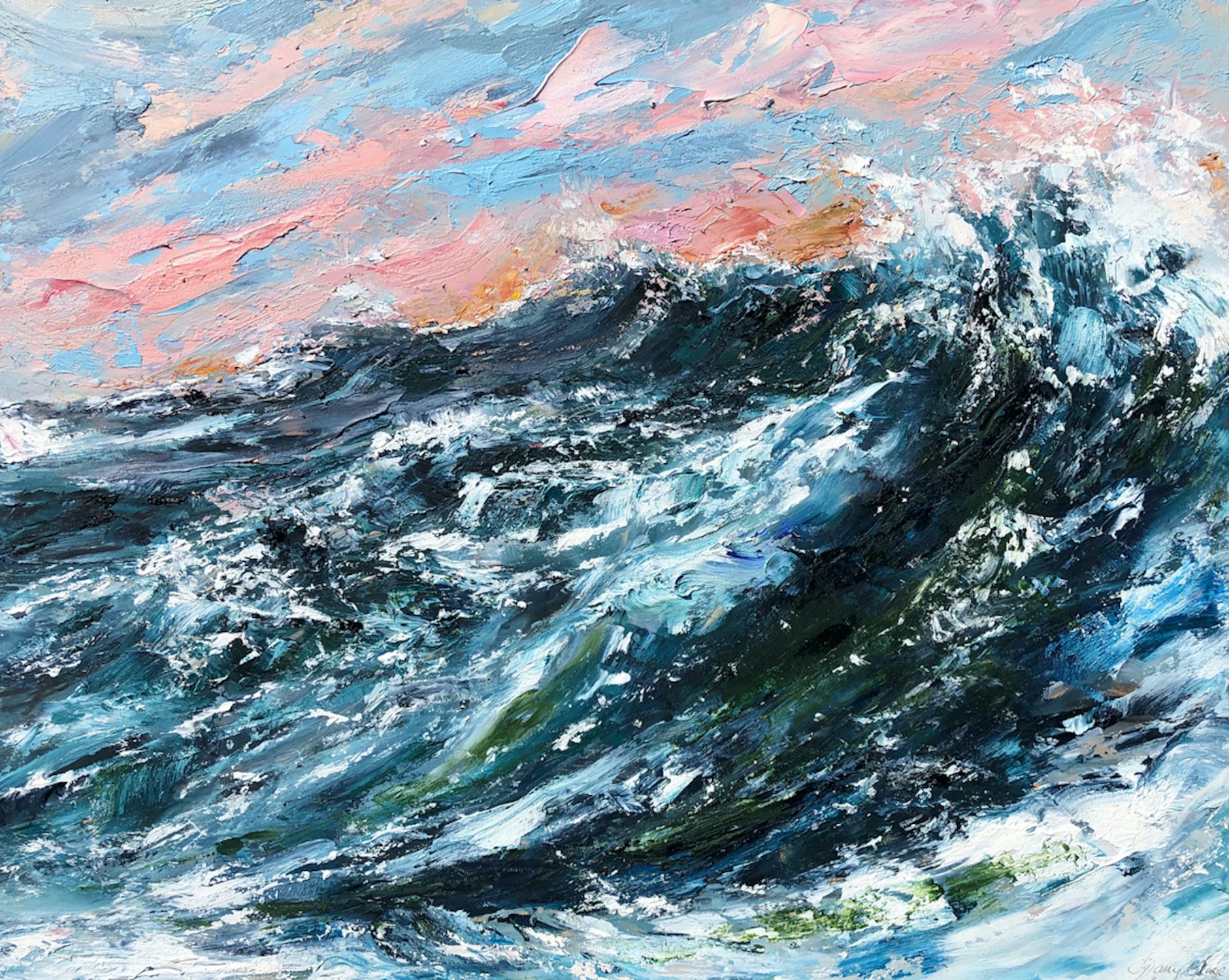 Original mixed media painting of a rising ocean wave at sunset. This dynamic artwork is inspired by the movement and energy of the ocean and expresses the vitality and transformative power of the sea, along with its intimate link to human emotion.