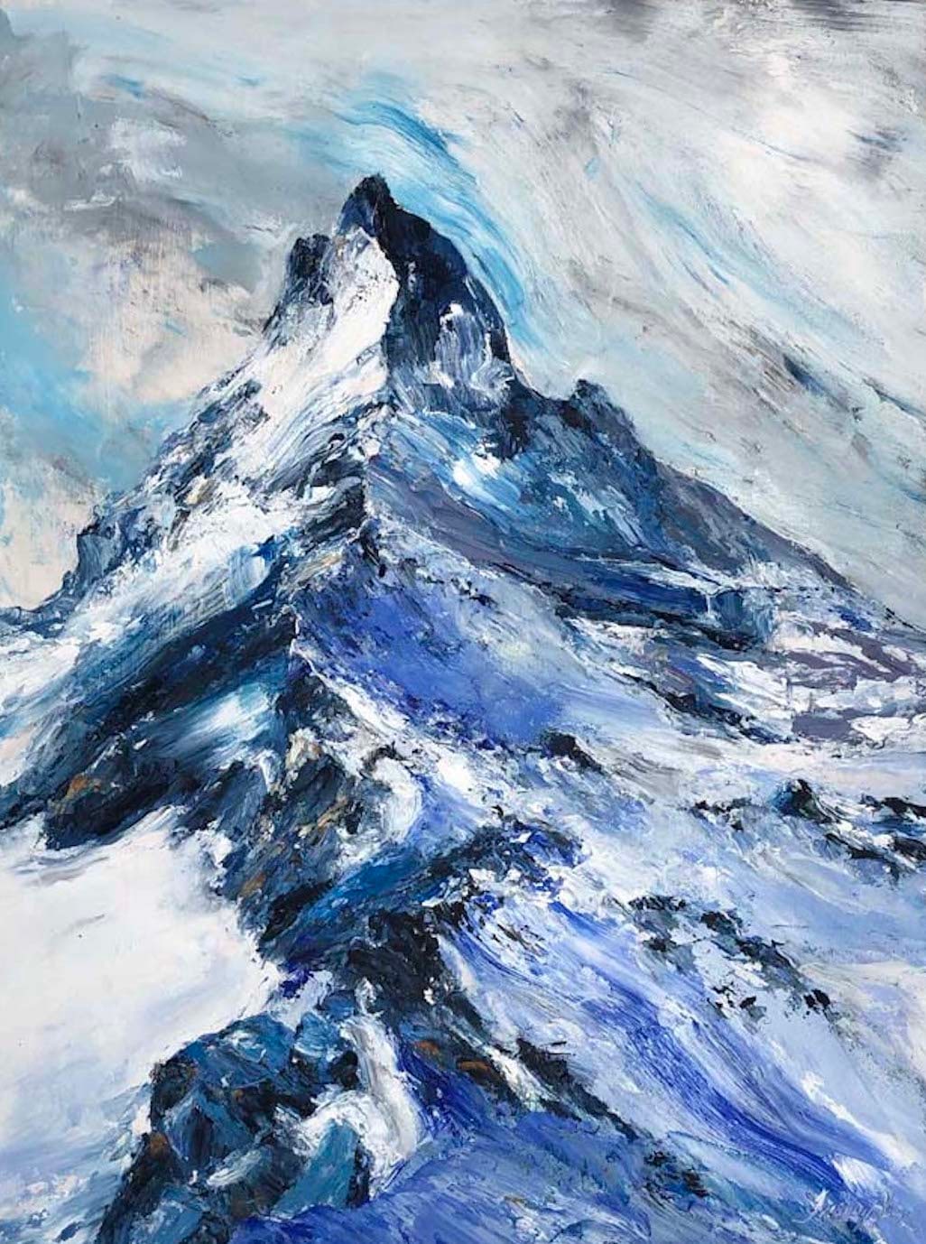 Original mixed media painting of the ascent up a snowy mountain peak. This textured artwork is inspired by the majesty and quiet strength of the mountains.