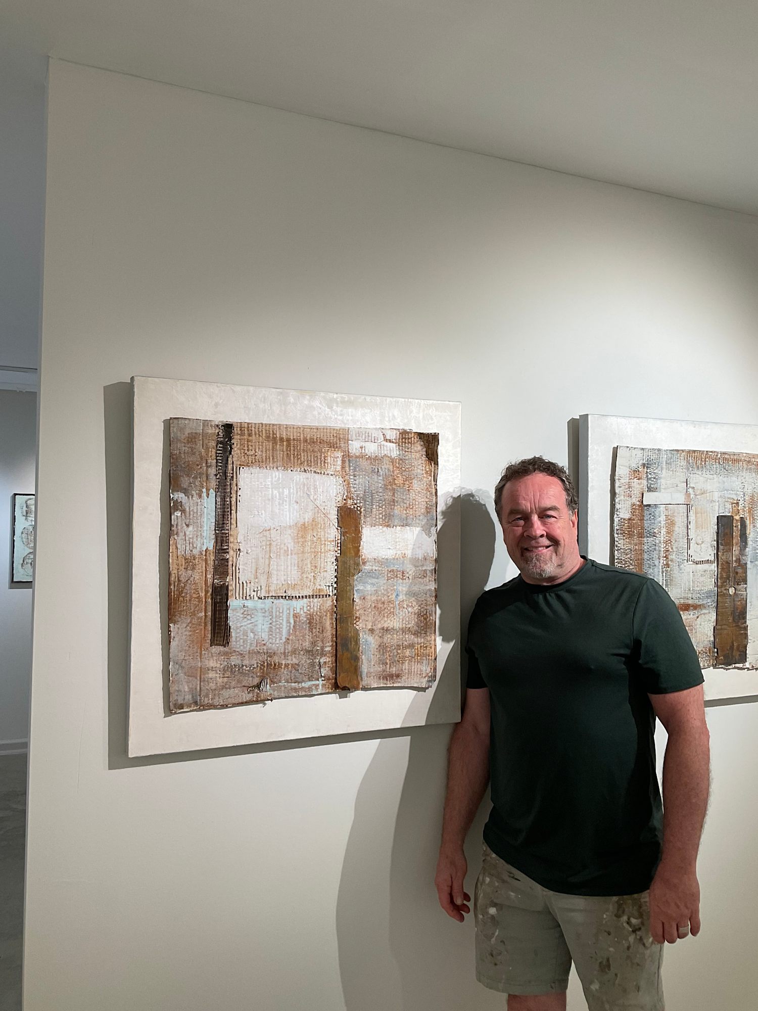 Mixed media abstract art using recycled cardboard, iron oxide paint mounted on limewashed canvas