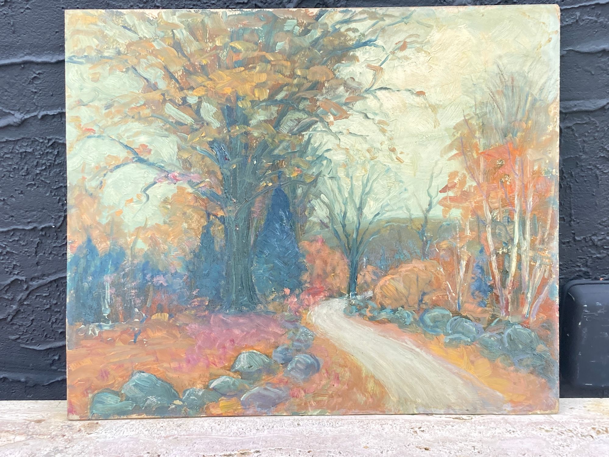 Carl G.T. Olson original painting on board fall path with trees and rocks #29