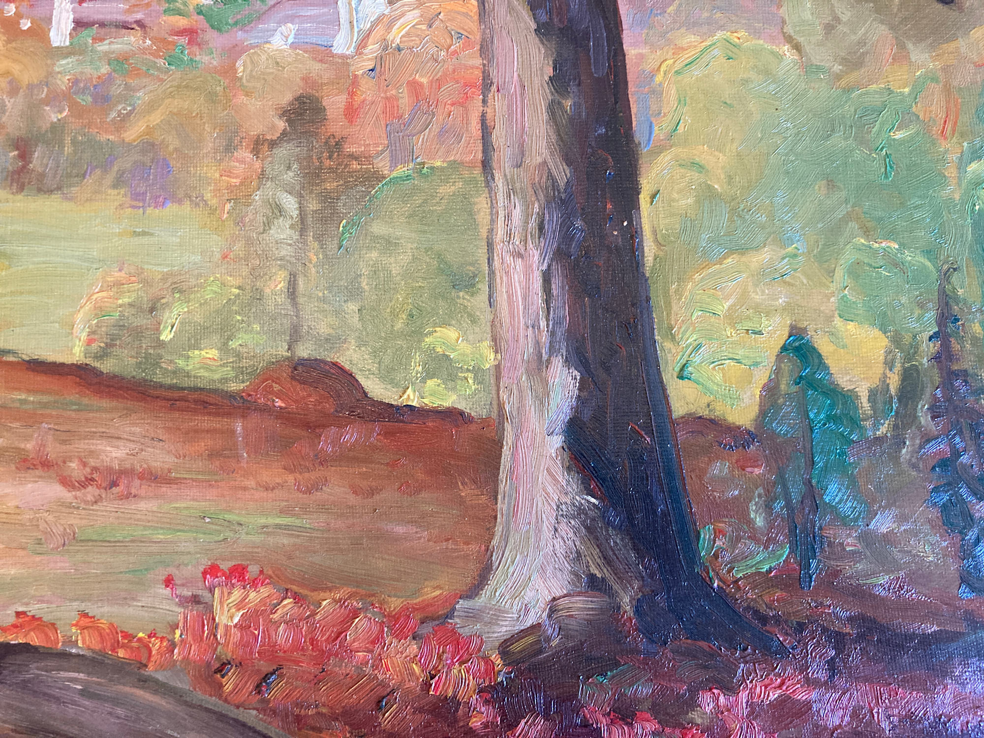 Carl G. T. Olson original painting on board fall scene with tree #90