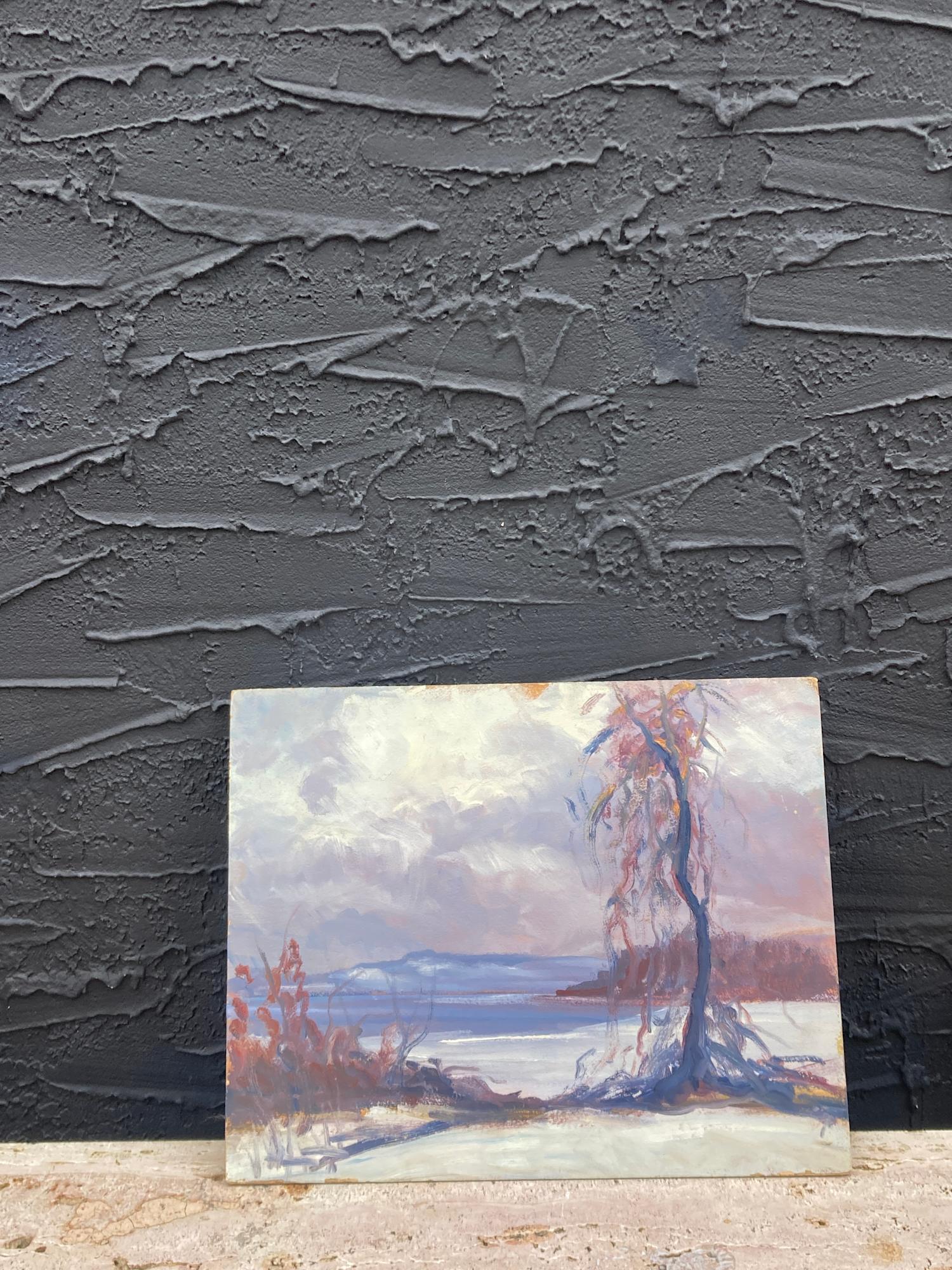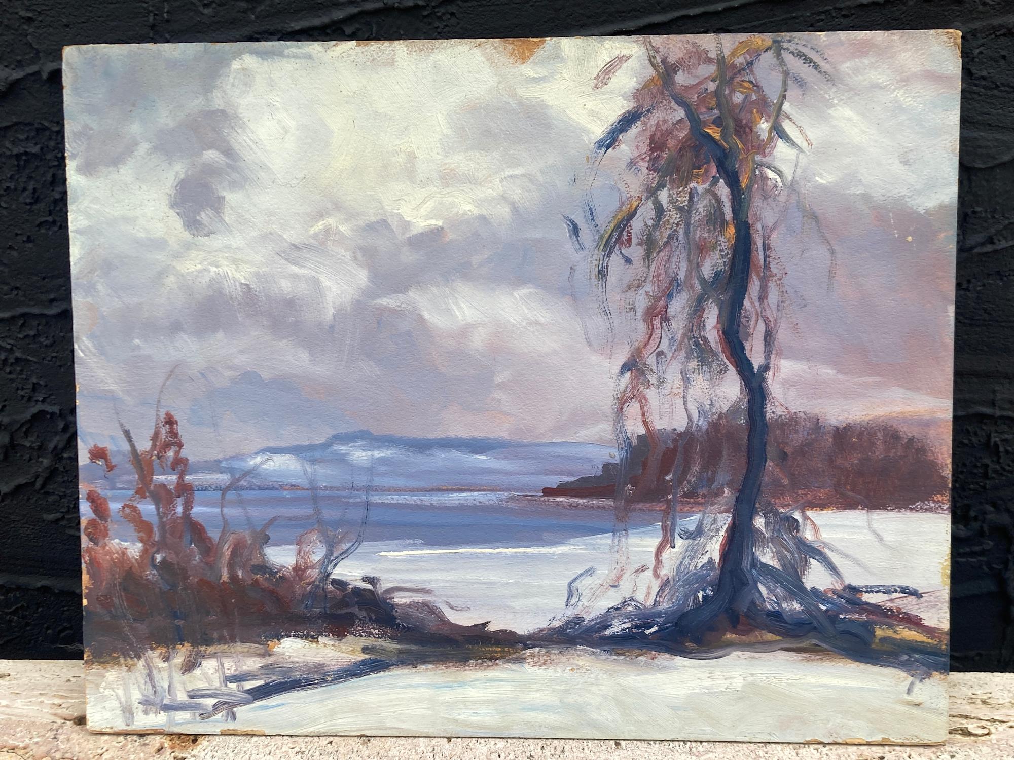 Carl G.T. Olson original painting on board winter lake scene with mountain #16