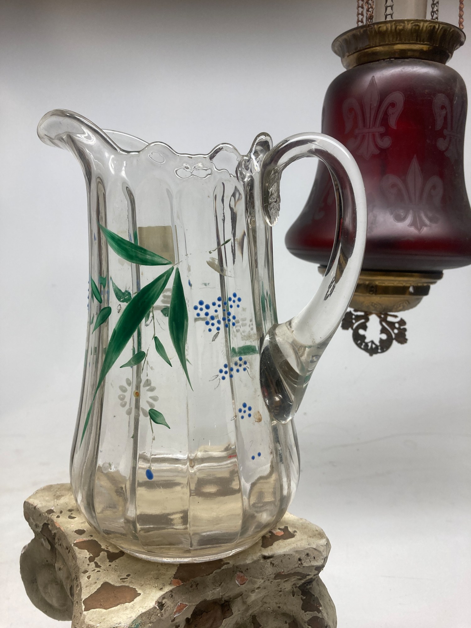 Clear glass water pitcher with hand painted details