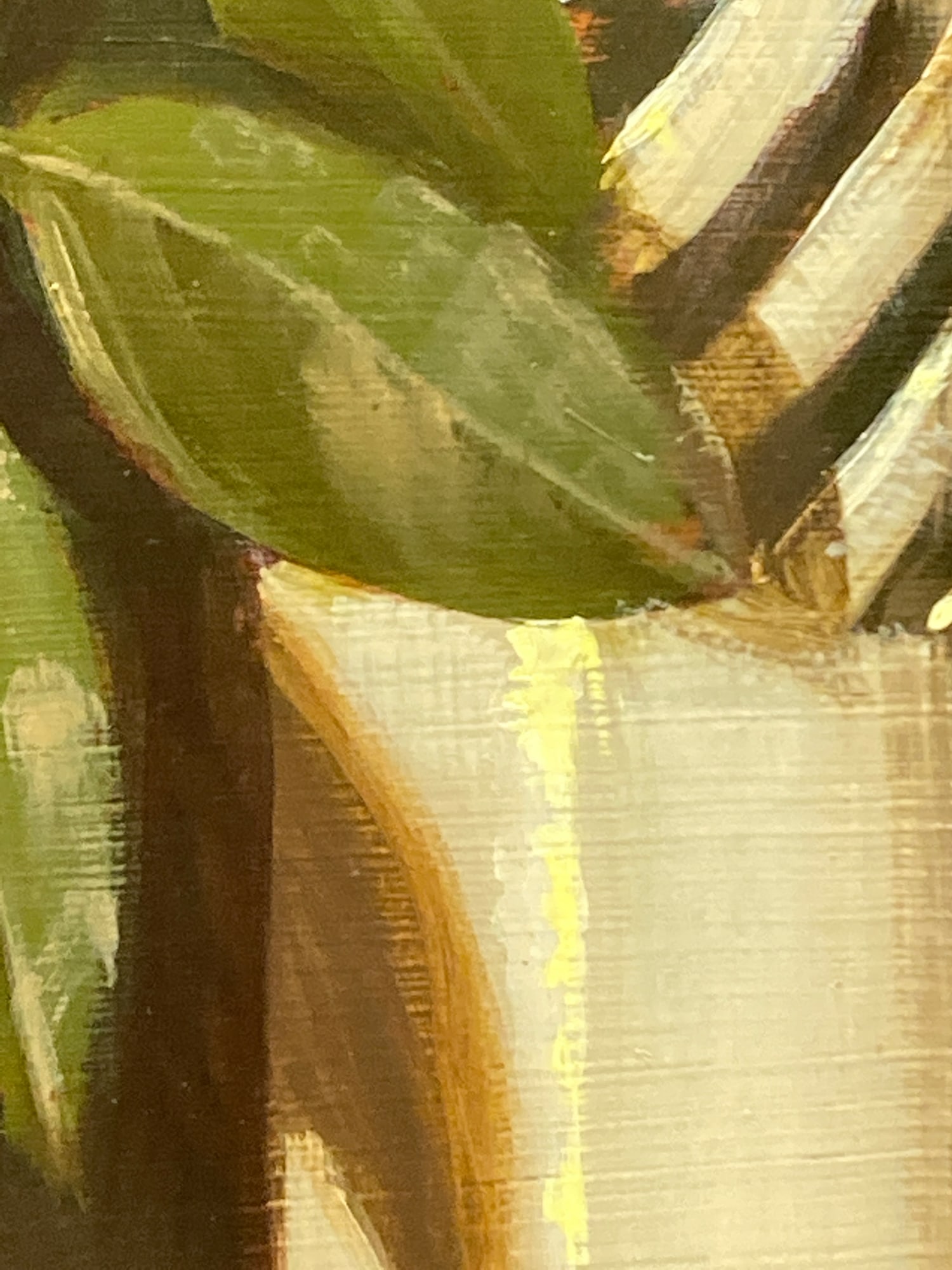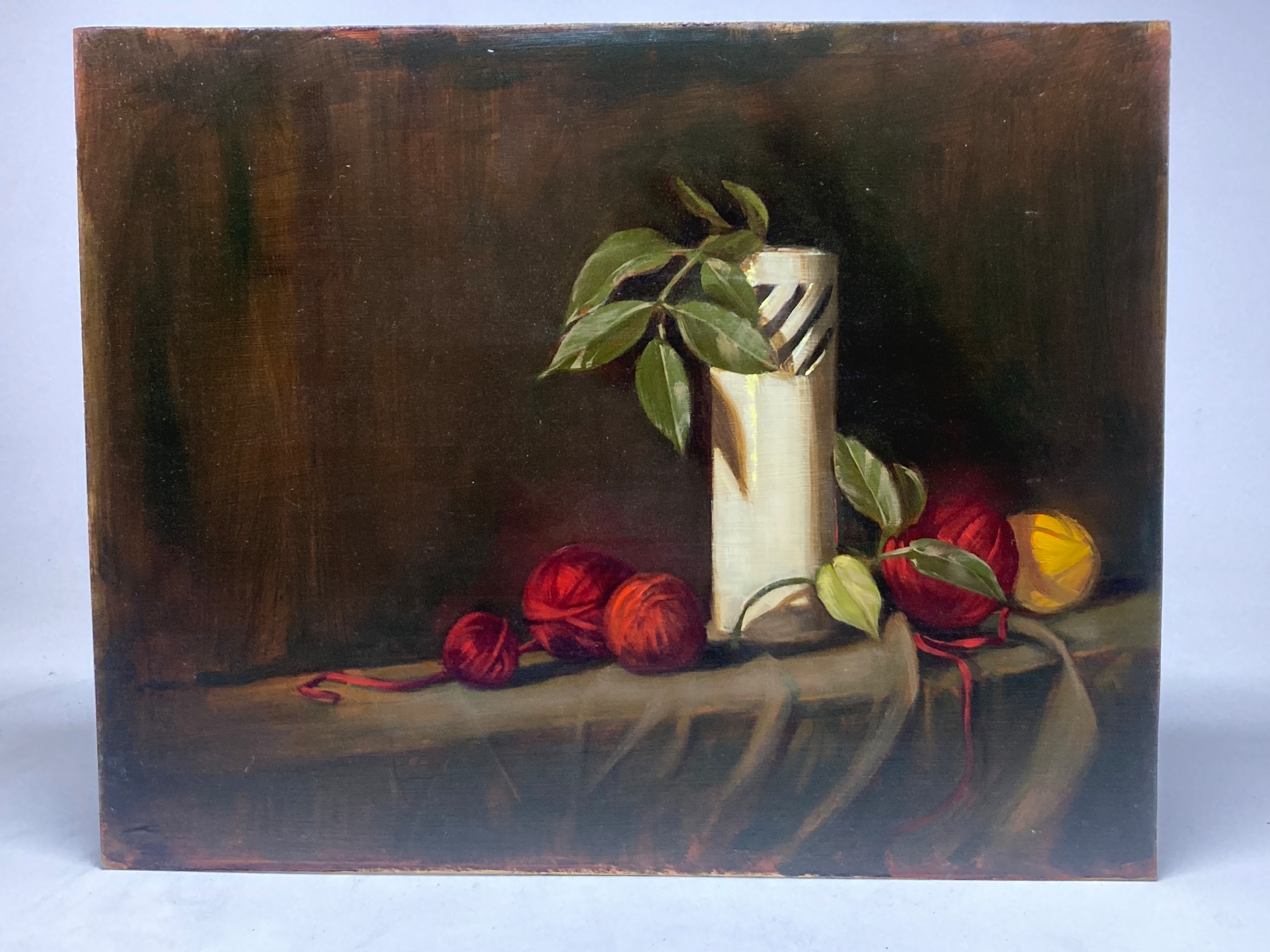 Framed still life with white vase and yarn
