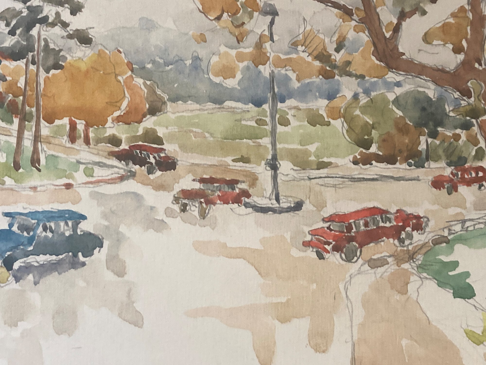original watercolor of French street scene with cars