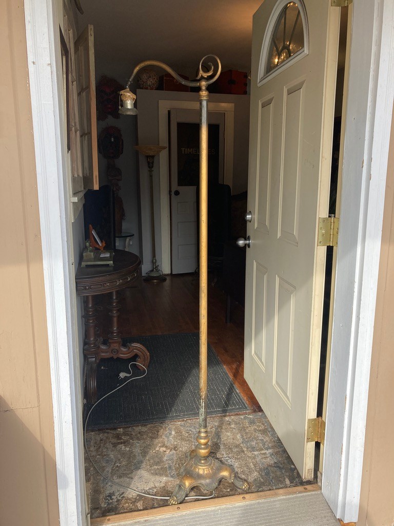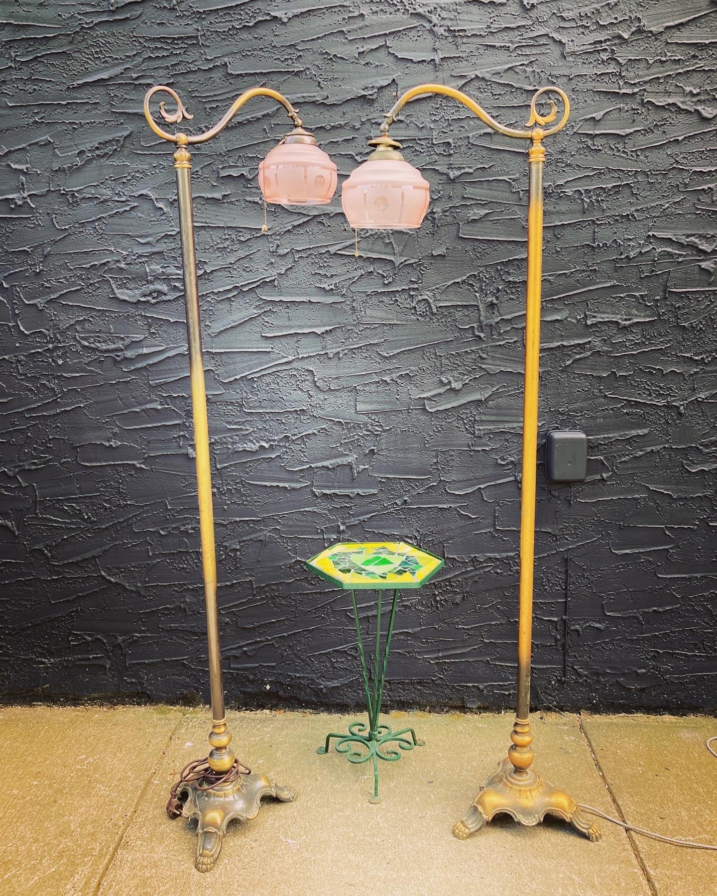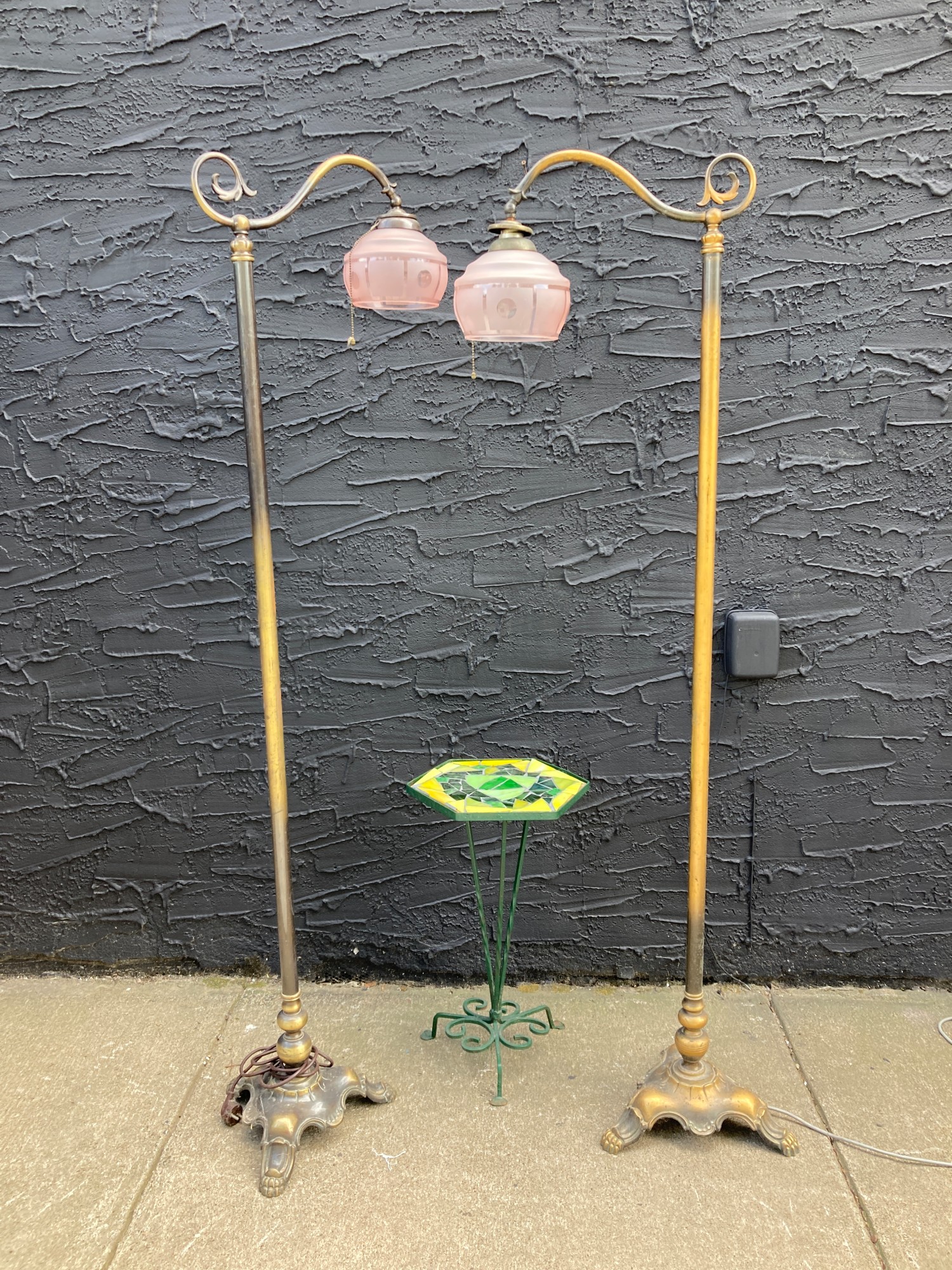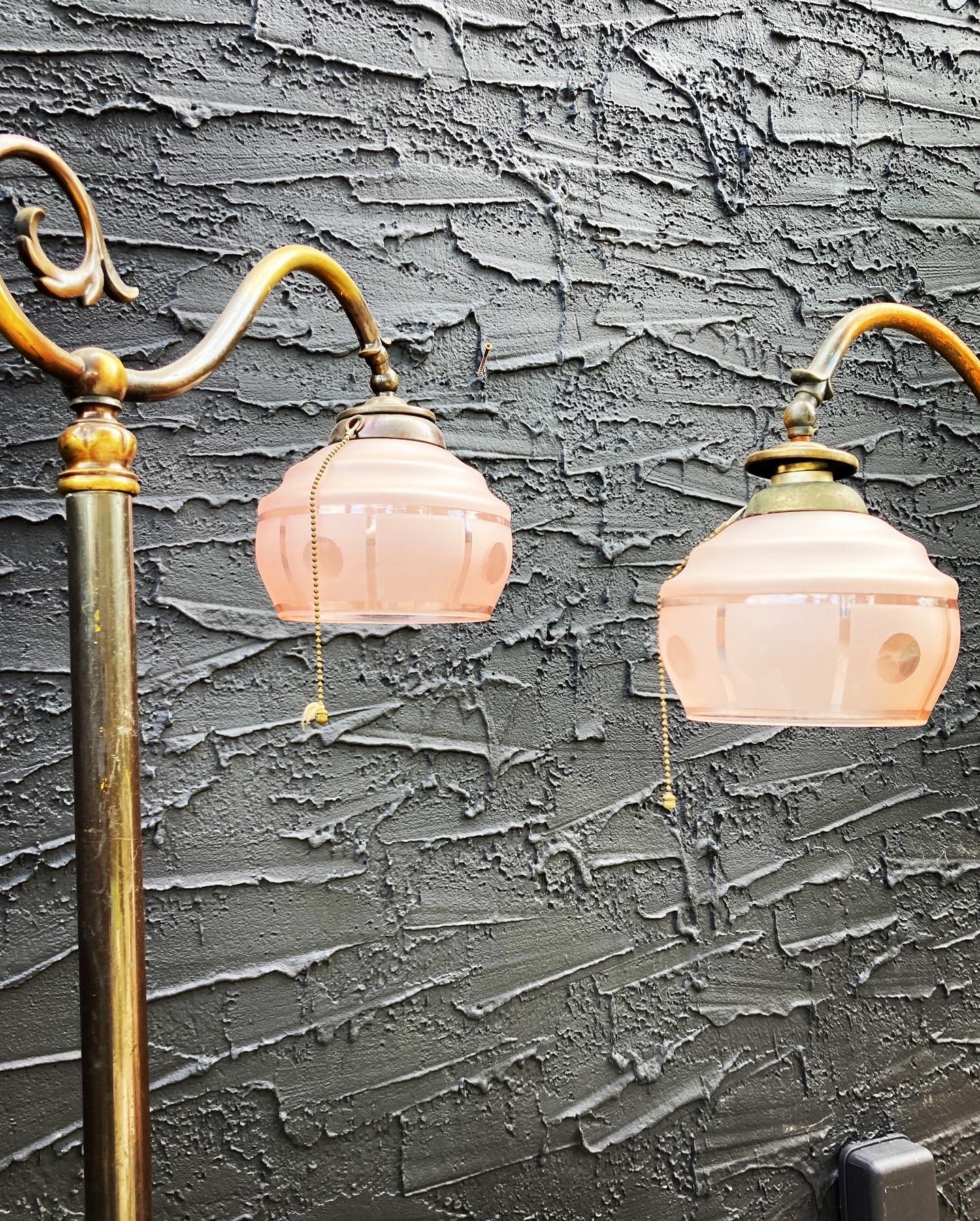 ornate footed brass bridge floor lamp with pink art deco glass shade