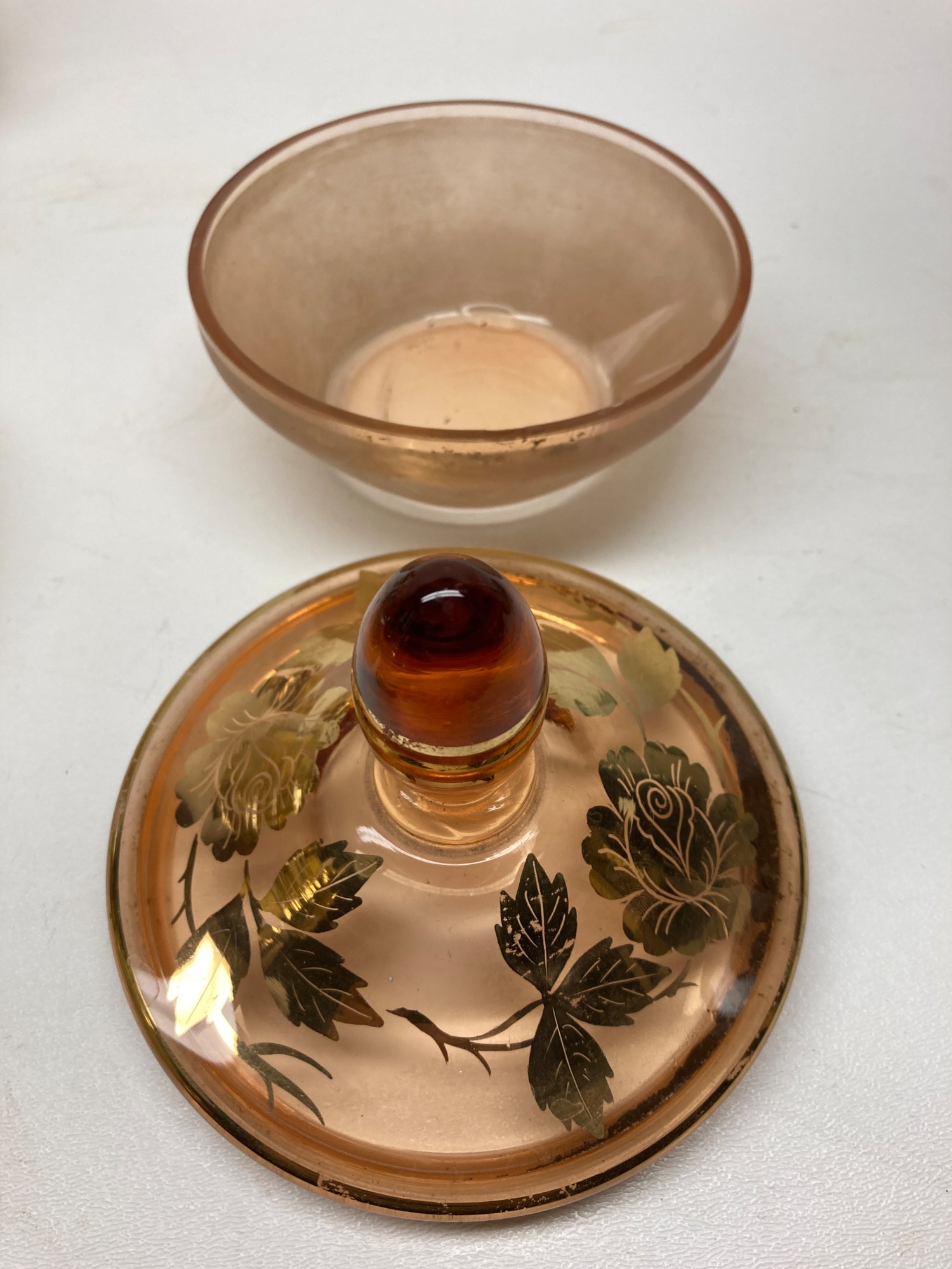 Pink with gold glass Art Deco Perfume covered perfume dish