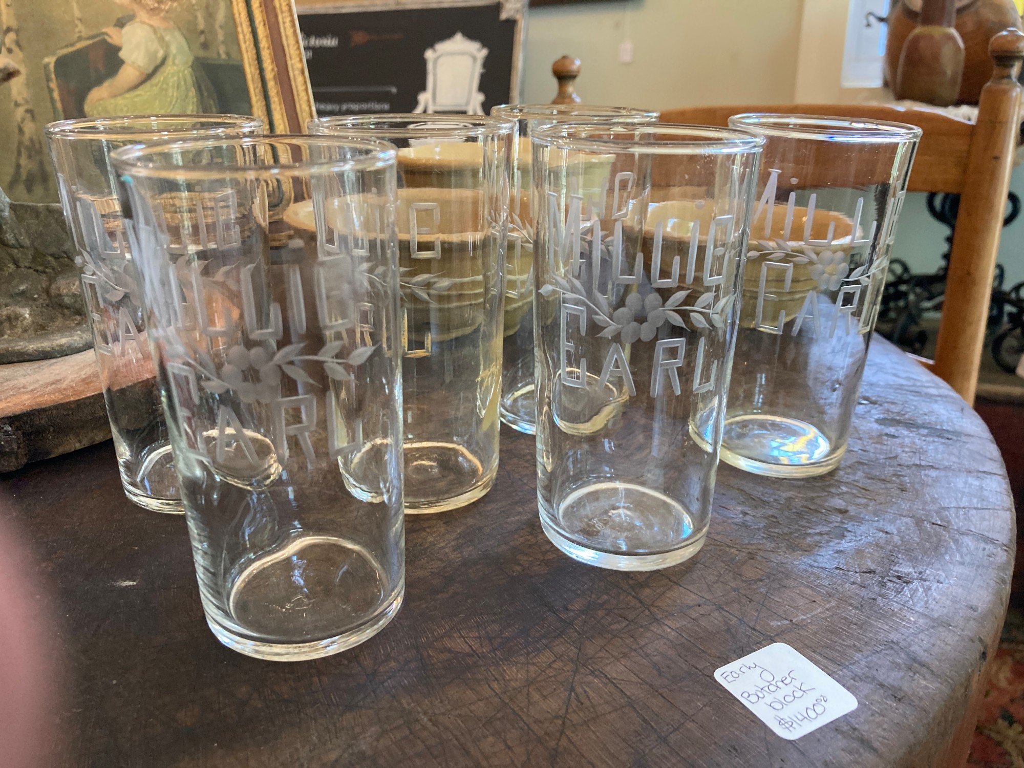 set of 6 etched water glasses Millie and Earl