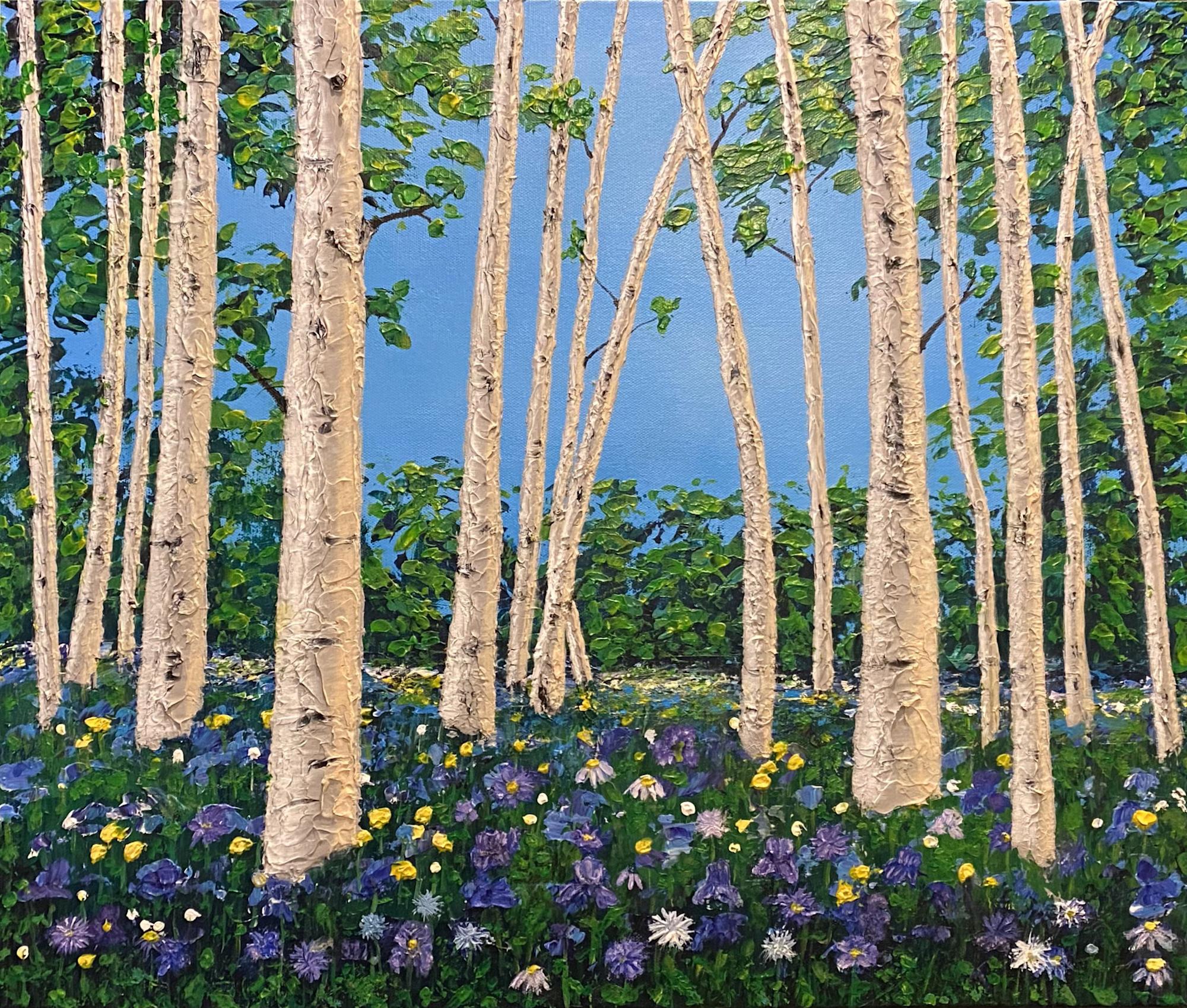 Made with heavy body acrylics for the tree trunks, flowers, vegetation, and leaves.
