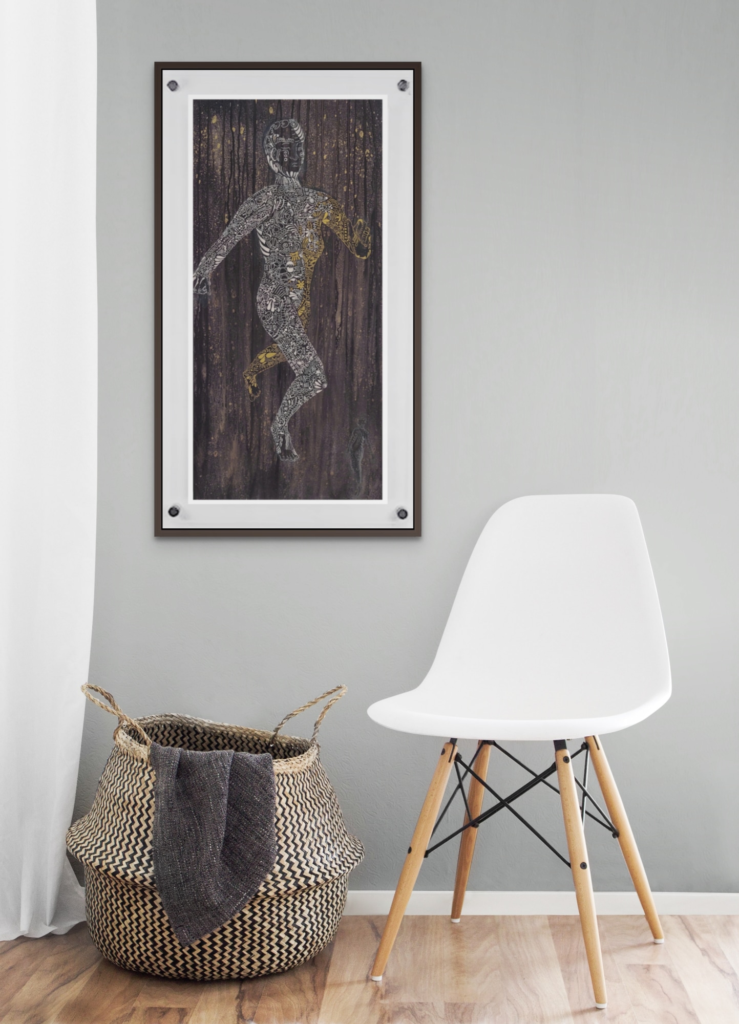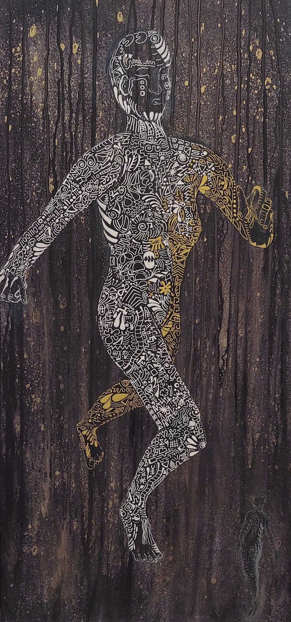 The background was created using layers of ink washes and a mix of acrylics, pastels, and charcoal, establishing depth and complexity. Symbolically, representing our interdependence with space, which literally embraces and supports our being.