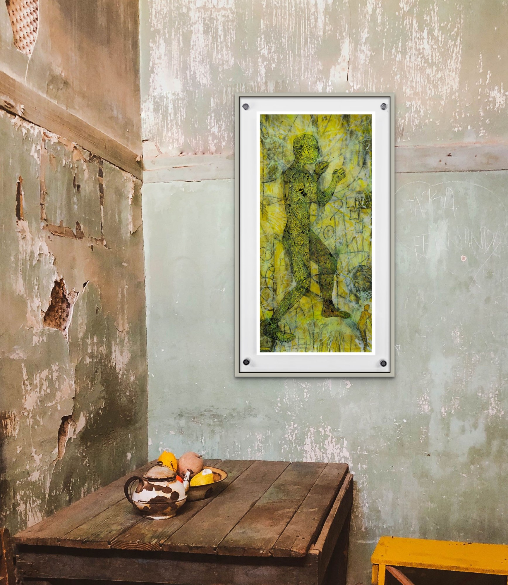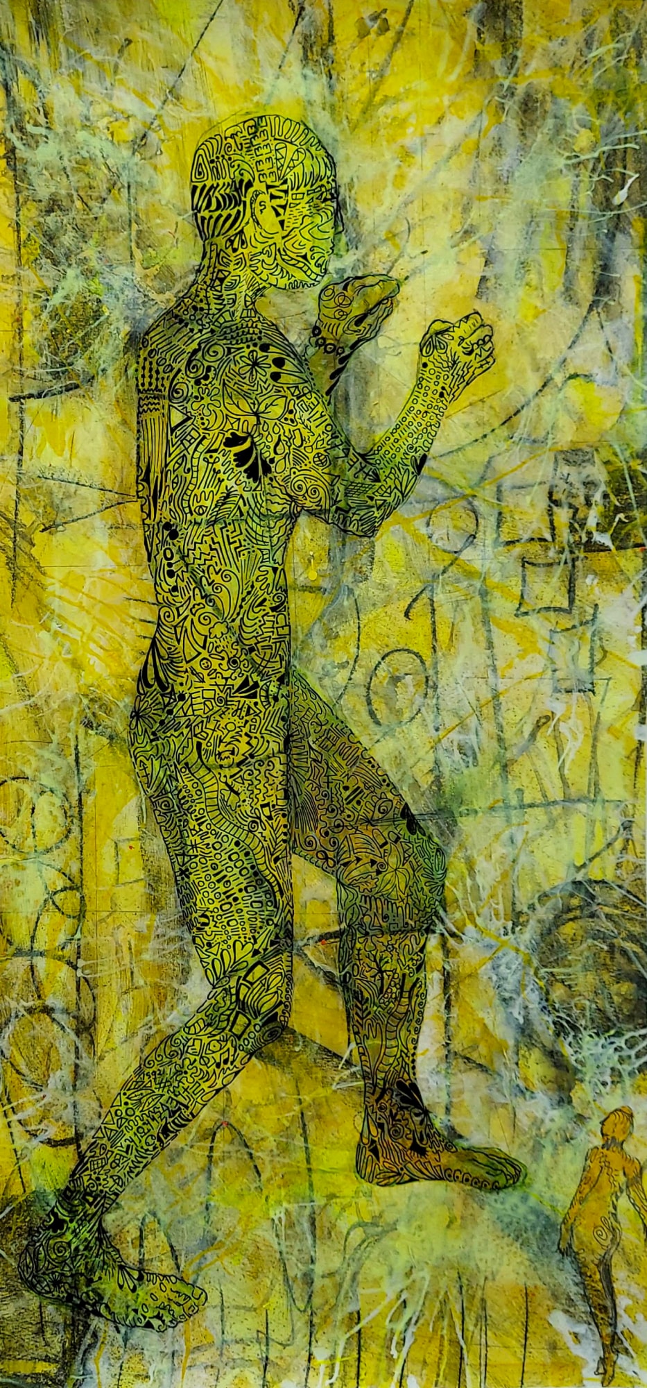 The background was created using layers of ink washes and a mix of acrylics, pastels, and charcoal, establishing depth and complexity. Symbolically, representing our interdependence with space, which literally embraces and supports our being.