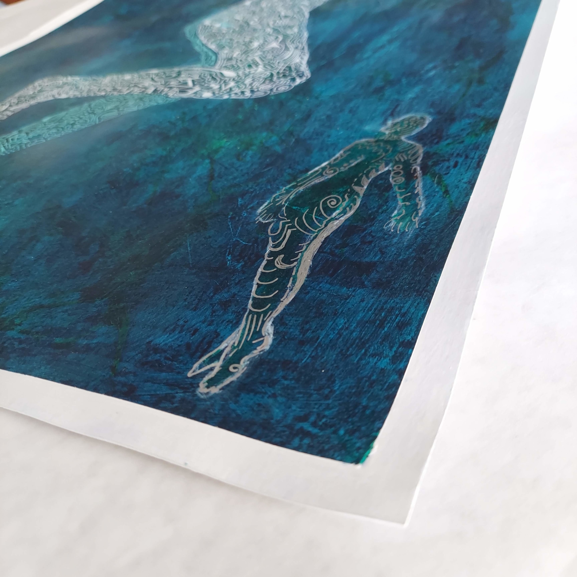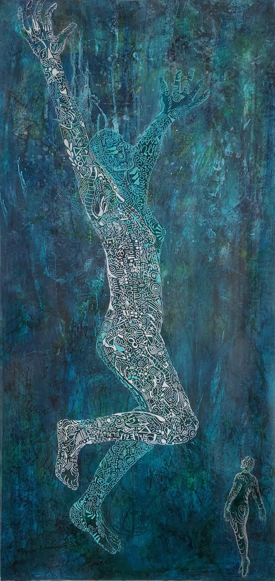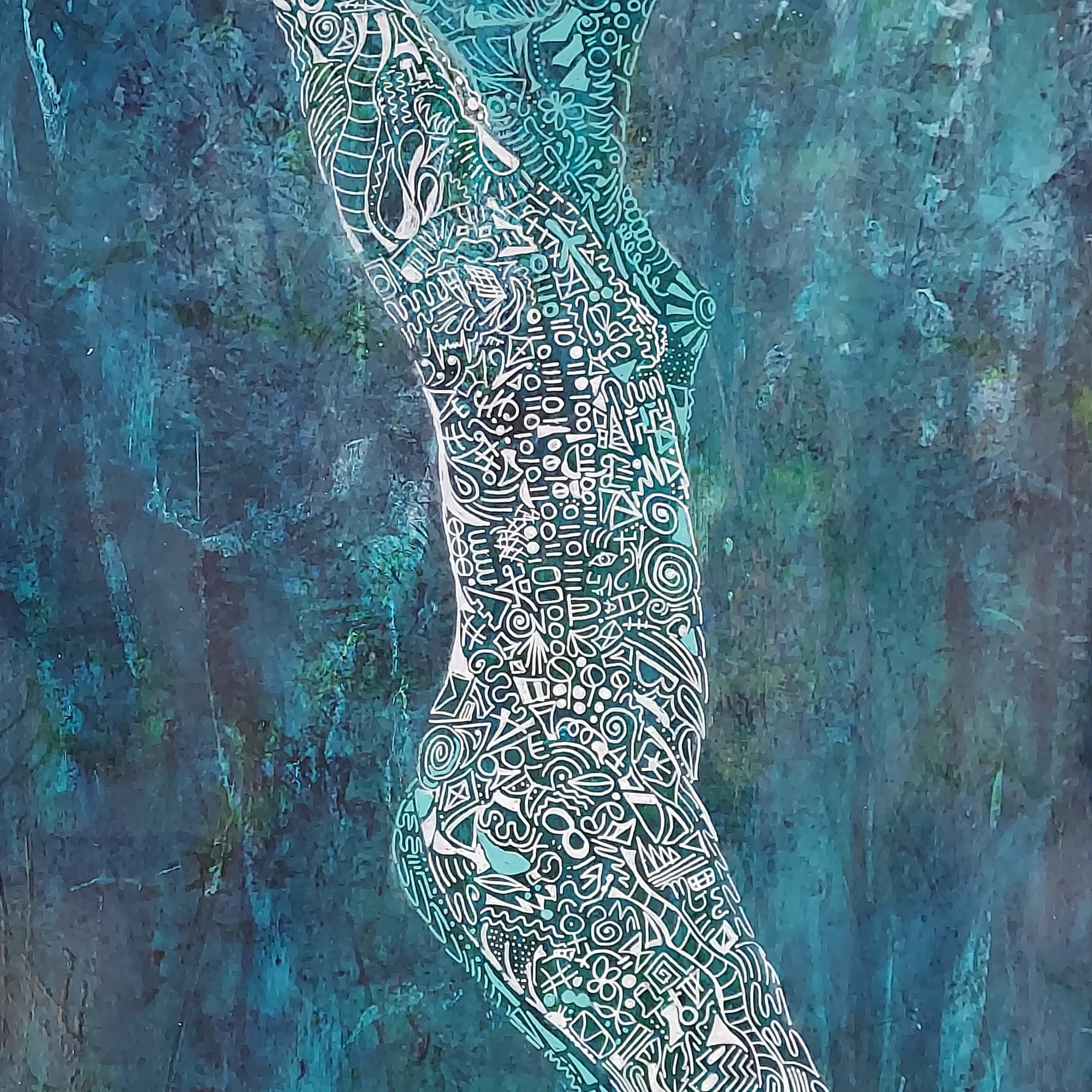 The background was created using layers of mixed media establishing depth and complexity.