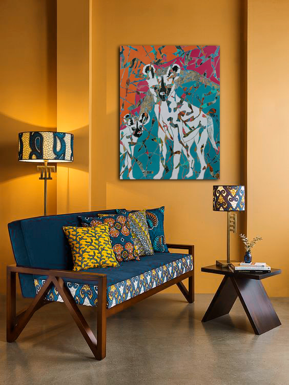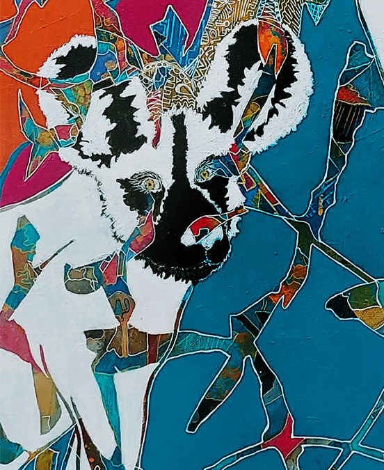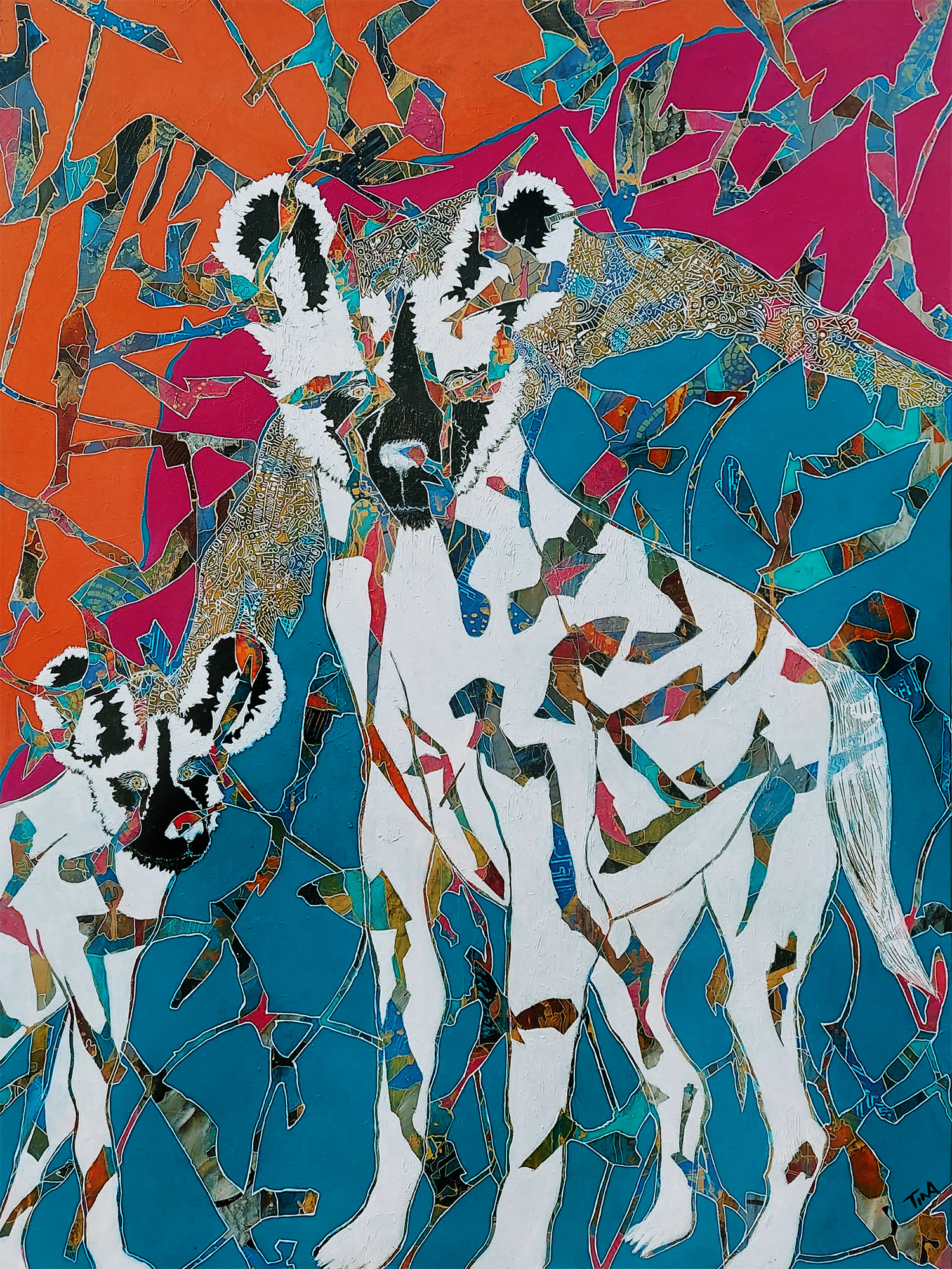 This artwork celebrates the positive shift in the plight of African Wild Dogs, previously endangered due to wildlife conflict. Serpentine-like shapes in the backdrop reflect this festive mood.