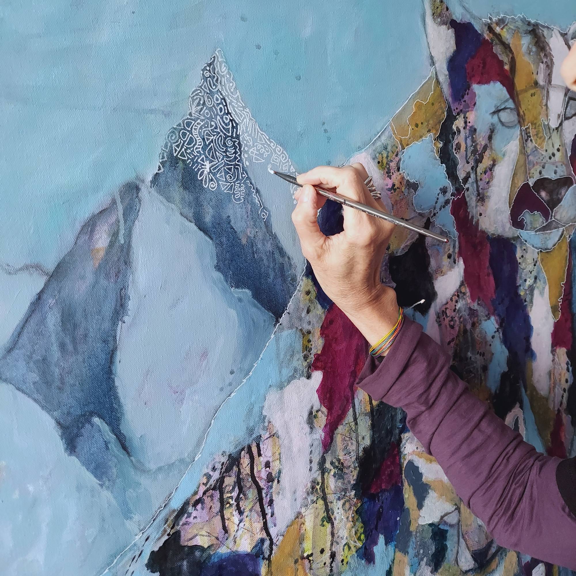 In creating this piece, I wanted to capture the fleeting presence of the snow leopard and its cub—guardians of a world on the brink. The abstract, layered mountains stretch high, but their snowy blankets are thinning—a quiet warning from a warming planet. These elusive cats, so well adapted to their rugged terrain, now face shrinking territory, dwindling prey, and mounting threats to their survival.
