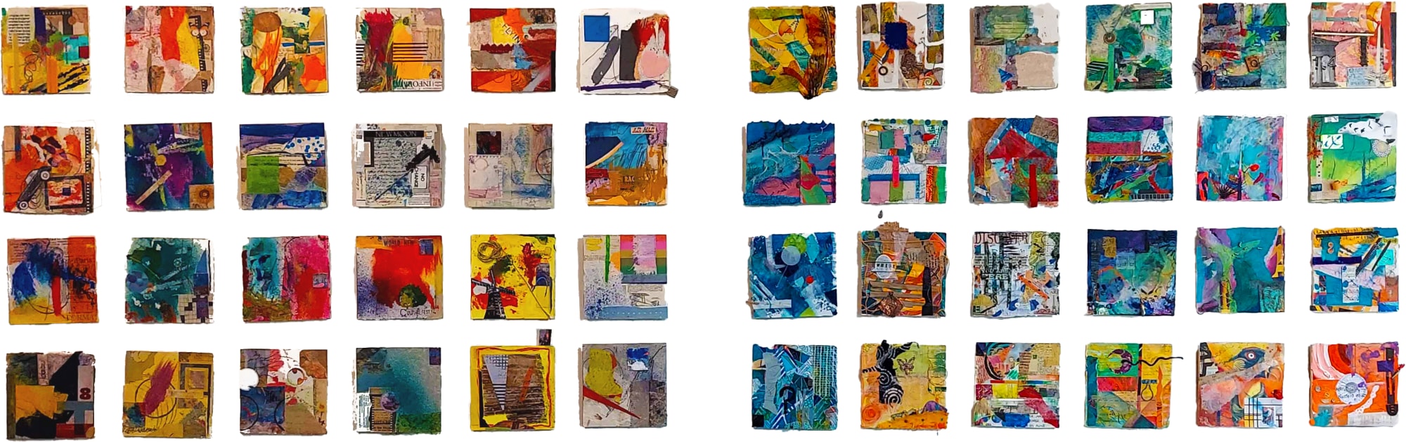This collaborative project emerged from the shared aspiration of two artists with distinct artistic approaches, uniting their creative visions to engage in a visual dialogue. There was no commentary agenda except to just be in the moment and respond. Over the course of several months, Tina responded to two original collages created by Mikel by crafting 2 collages in response. They did this 24 times to create the existing 48, 6"x6" conversation.
