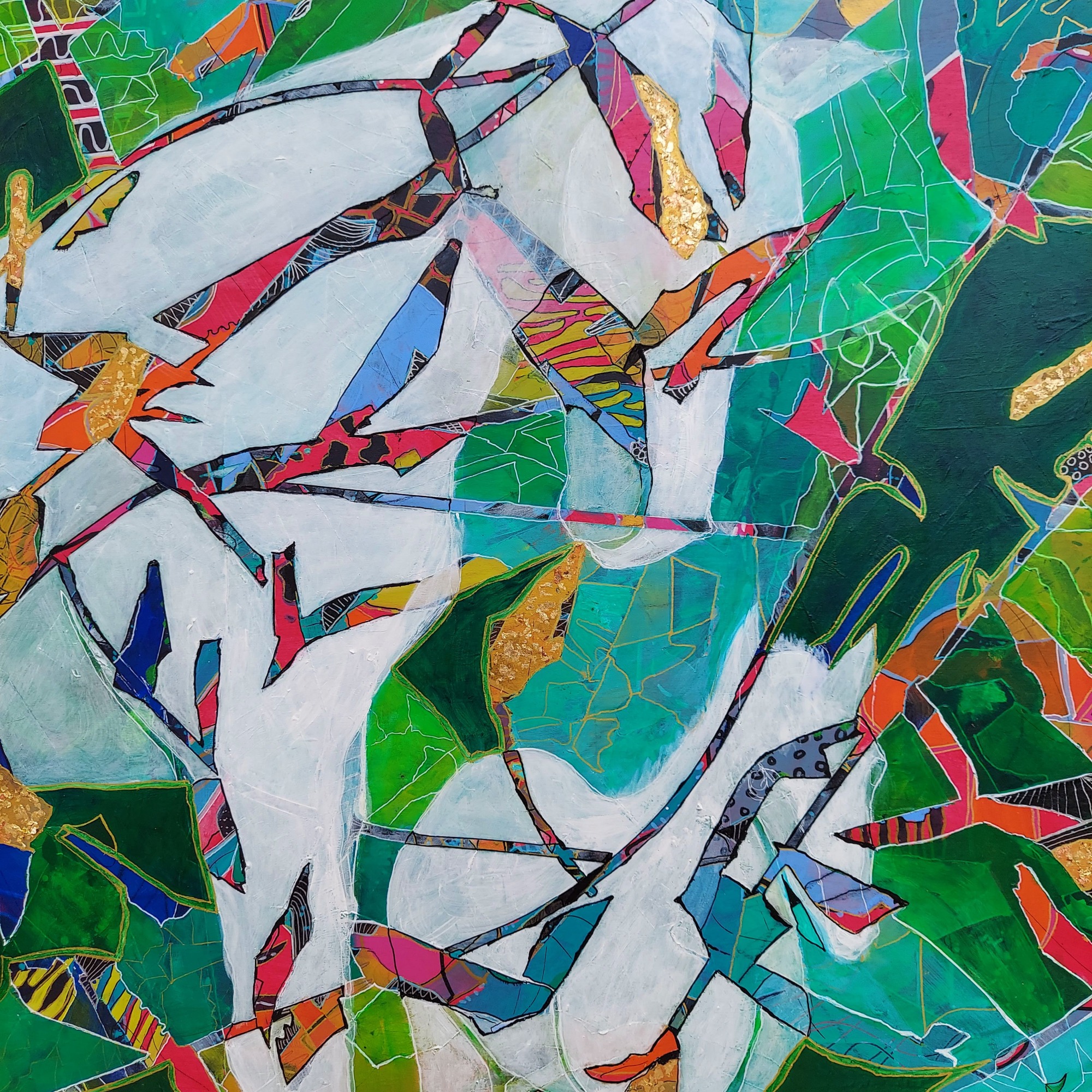 The white is a nod to all those horses disappearing from our landscape. The tumultuous background references the deafening noises of the helicopters and the chaos caused while corralling these wild creatures creatures.