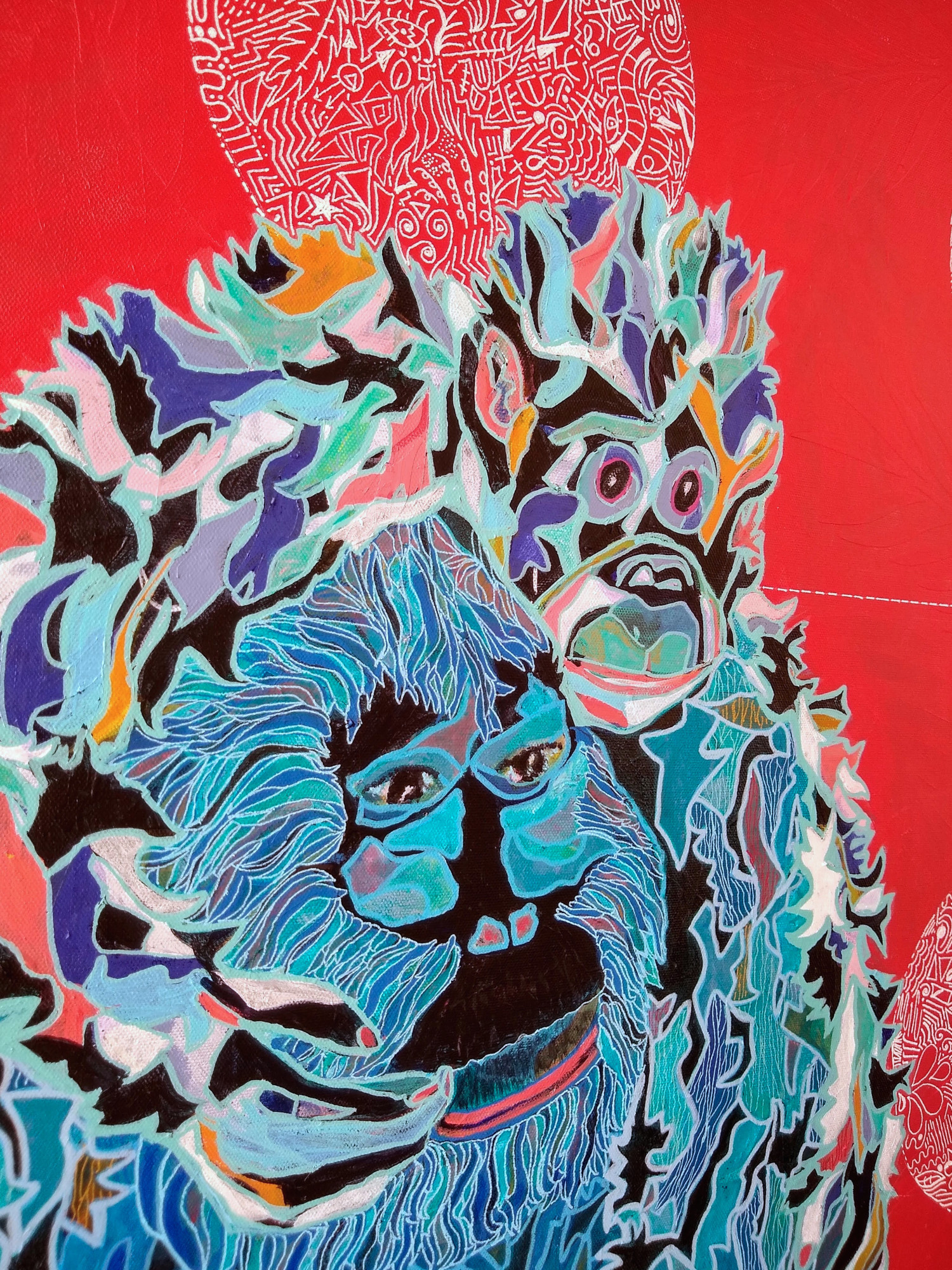 The abstract shapes painted within the figures allude to the way urban planners divide land—grids, plots, and zones—symbolizing how human development encroaches on natural habitats and contributes to the loss of biodiversity. Vibrant colors, a hallmark of my expressive world, symbolize hope and suggest a sense of possibility—offering a counterpoint to the underlying despair of species extinction and habitat loss.