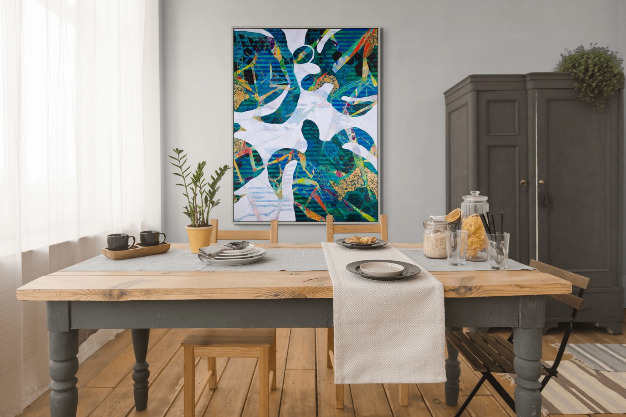 This artwork sheds light on the plight of turtles. Each year, thousands of turtles drown due to entanglement in nets or the ingestion of plastic debris floating in the oceans. If humans adopted more sustainable practices, perhaps plastics could be eliminated from the equation of daily living. The white background underscores their vanishing habitats, and the gold, a recurring color in my work, serves as a metaphor for healing.