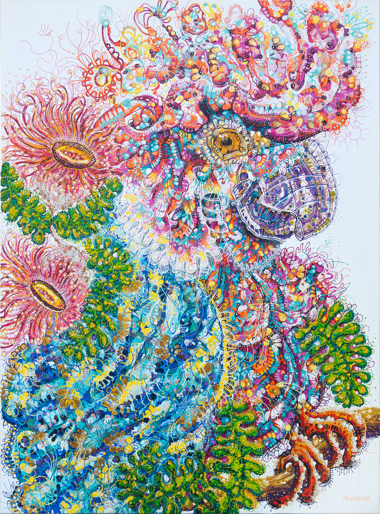 In mid 2018, I was asked to design and illustrate a print for a new range of bike wear. It was to be a celebration of Australian flora and fauna and contained galahs, gumnuts and leaves... Geraldine is one of those galahs. Whilst the illustration was finalised on the computer, Geraldine has been brought to life with thick acrylic paint, intense colours and lots of fine details. She is happily perched on a branch and surrounded by gumnuts and wiggly leaves. Please take the time to view the close up images to see the intricate details.